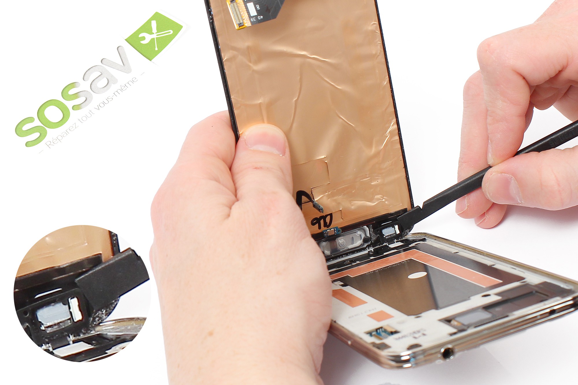 N'essayez d'ôter totalement l'écran LCD. La nappe de gestion du home est toujours attachée à votre Galaxy S5, vous risqueriez de l'endommager.