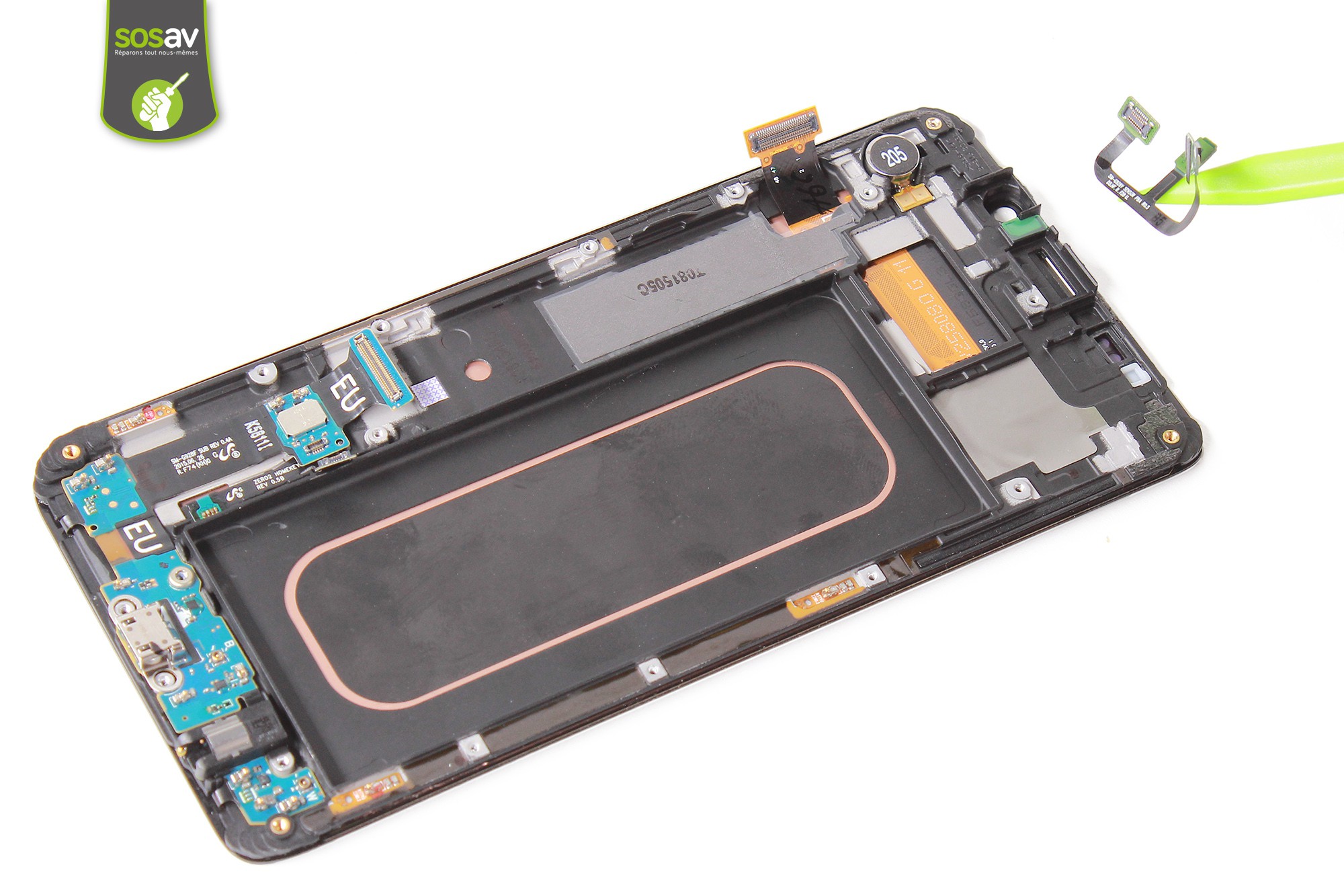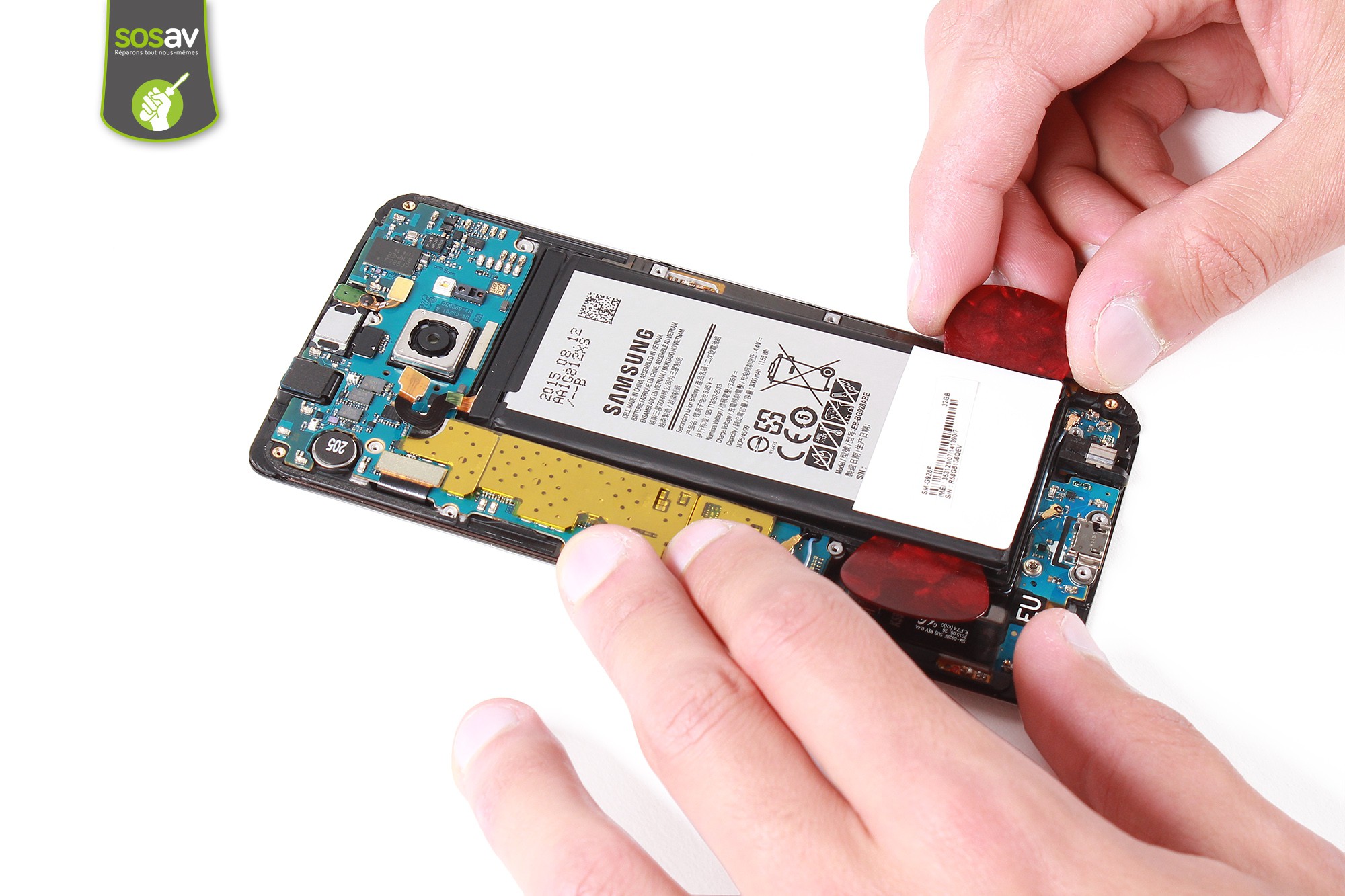 Depuis le Galaxy S6, le démontage du téléphone ne peut s'effectuer que par l'arrière. La batterie n'étant plus amovible et remplaçable sans ouvrir le téléphone, il faut alors s'armer de patience et d'un sèche-cheveux accompagné de plusieurs médiators afin de décoller la vitre très fragile et très sensible aux rayures.Il nous aura fallu pas moins de 12 minutes pour venir à bout de cette vitre sans avoir à l'abîmer. (ouf !)Avis aux amateurs : Soyez très vigilants lors du décollement pour ne pas abîmer votre téléphone !