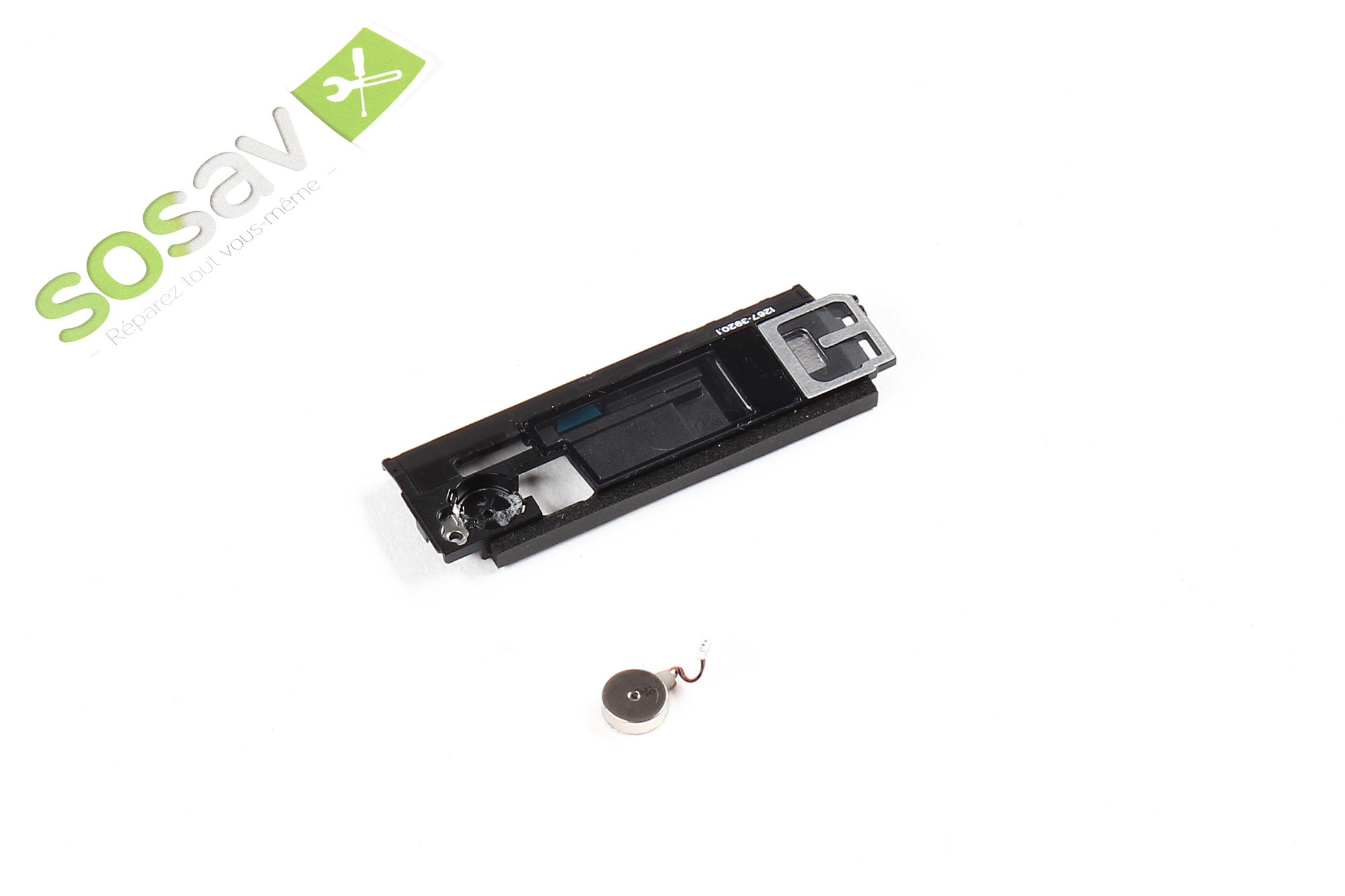 Avec une pince, sortez de son emplacement la calle en plastique blanc, afin de laisser apparaitre le connecteur du vibreur.