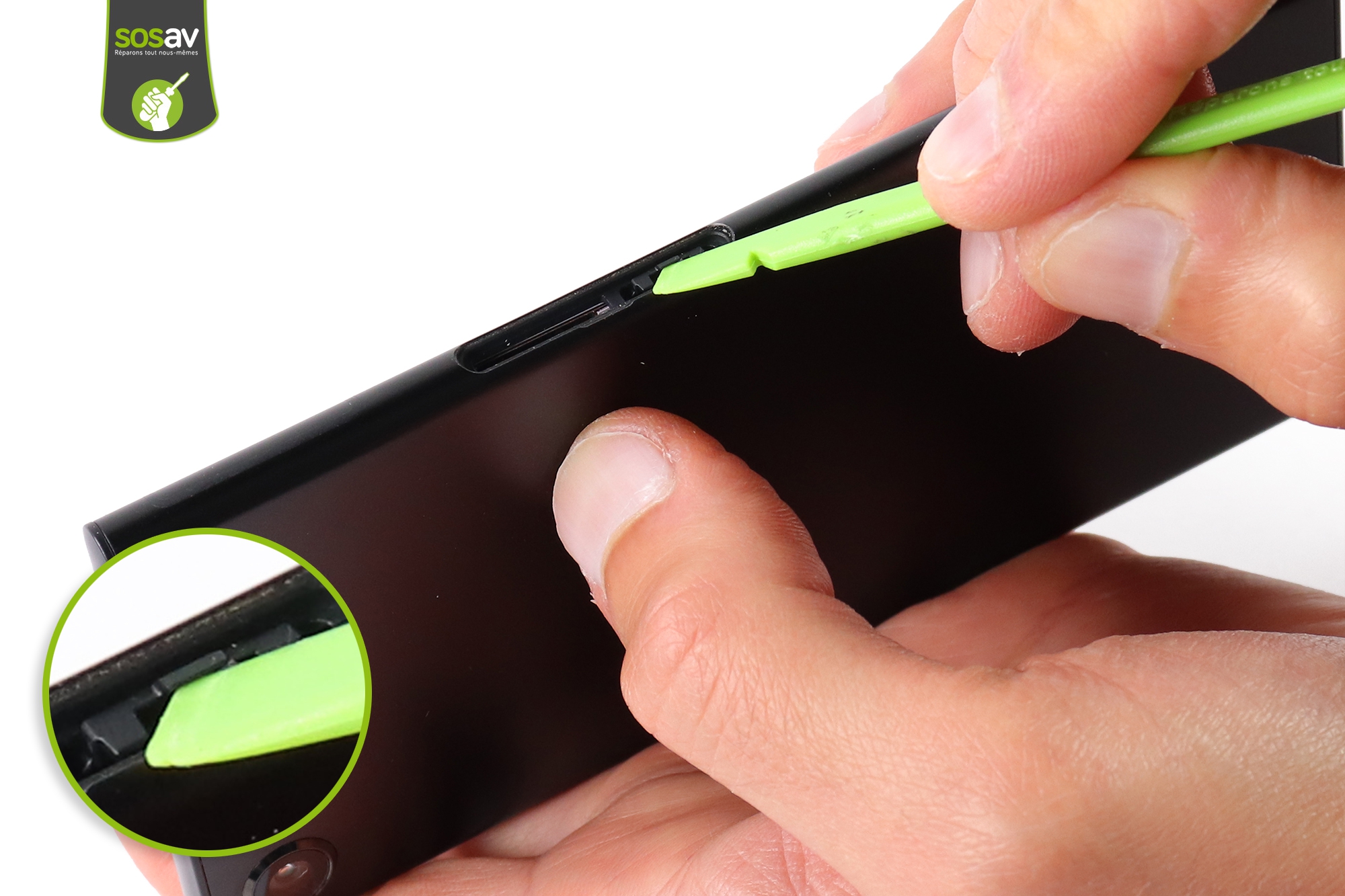 Servez-vous de la spatule en nylon pour sortir le tiroir SIM de son emplacement.Les 2 tiroirs se trouvent sur la tranche gauche !Le tiroir SIM est extrait.