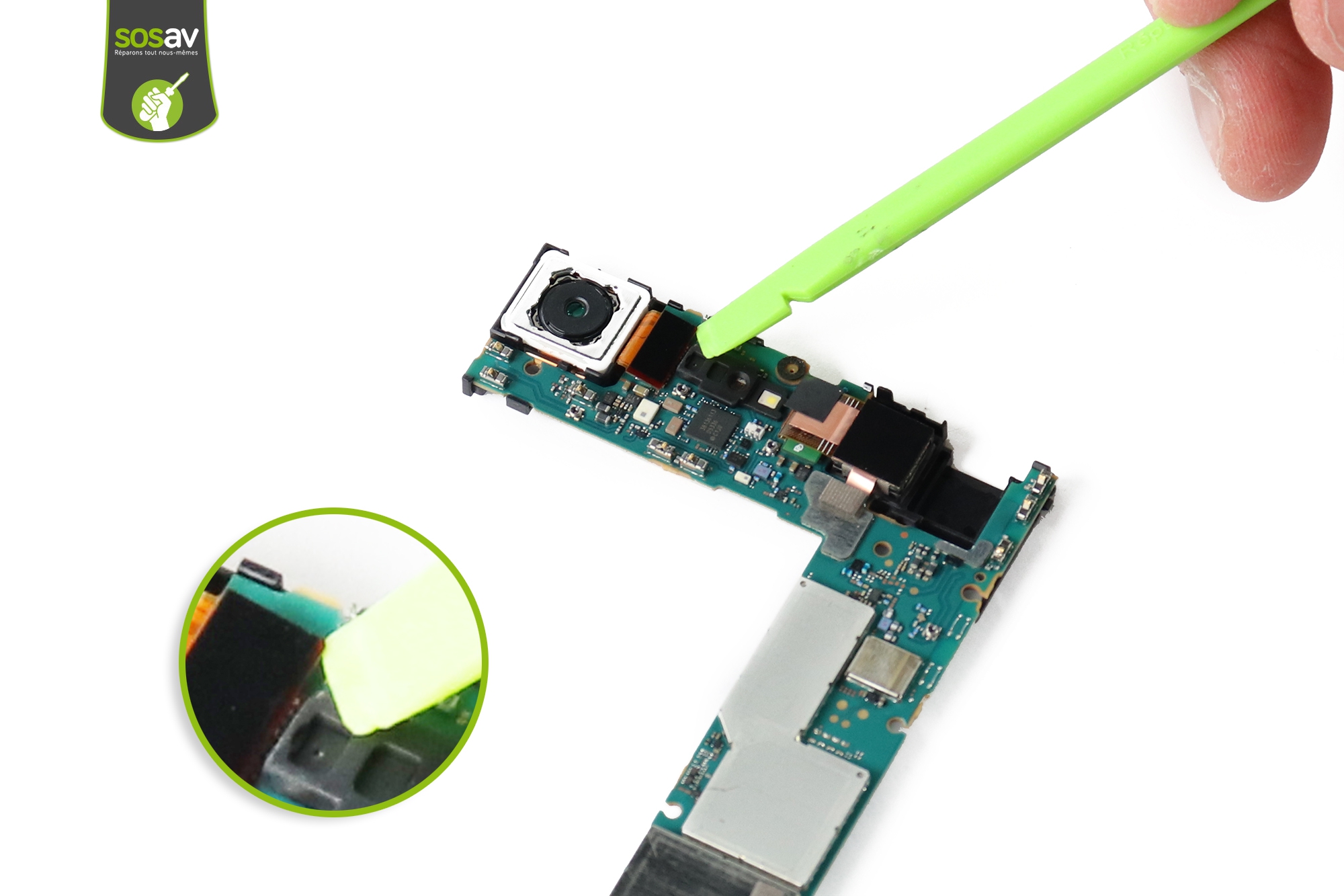 Conservez la spatule en nylon pour déverrouiller la nappe de la caméra arrière et la séparer de la carte mère.