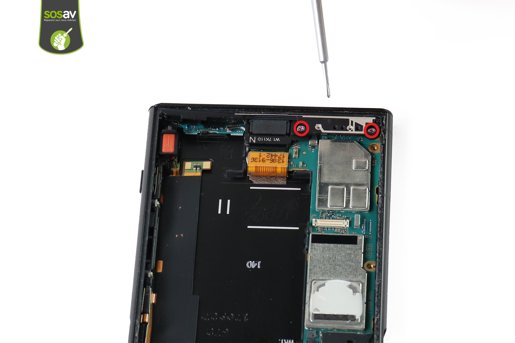 Retirez les 2 vis cruciformes entourées en rouge. (Photo 1)Puis sortez l'antenne inférieure grâce à la iSesamo.
