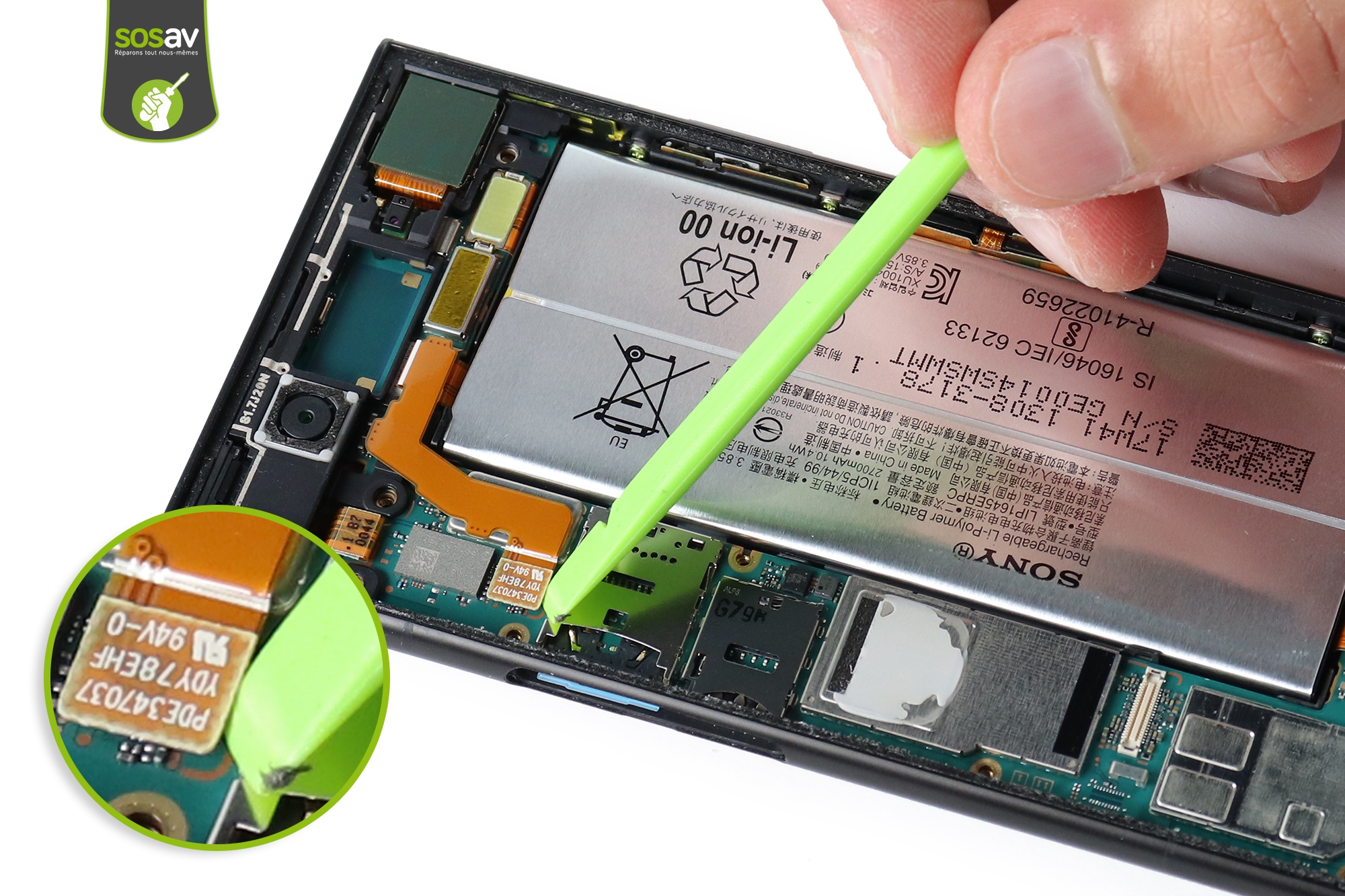 Déverrouillez la nappe de la batterie.Chauffez quelques secondes la face arrière opposée à la batterie pour ramollir la colle qui la retient.Attention à ne jamais chauffer la batterie directement !