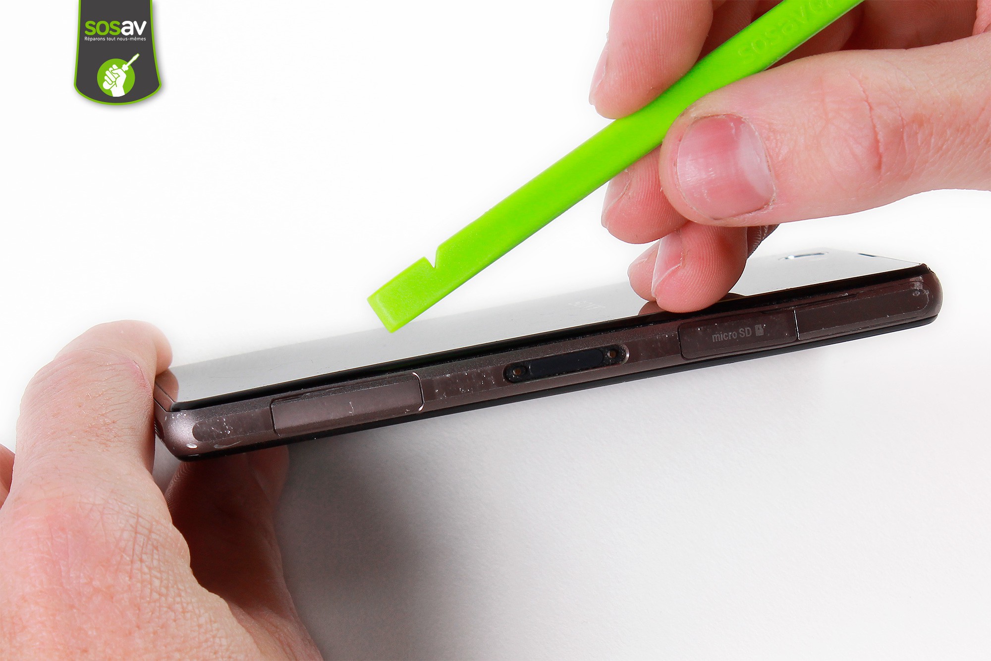 Avec la spatule en nylon, procédez à l'ouverture du cache MicroSD.