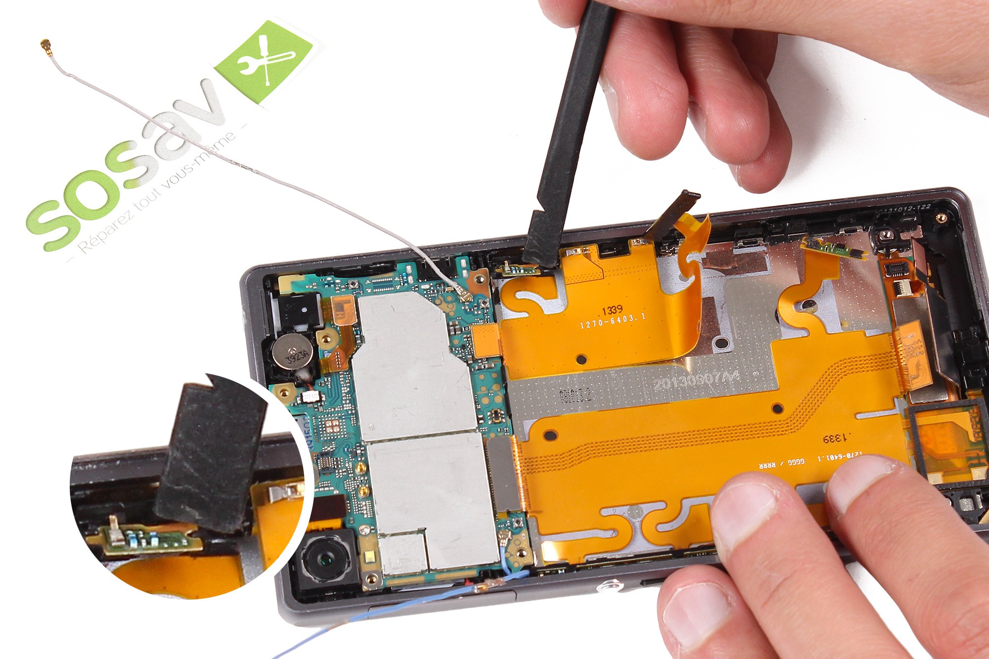 Déclipsez l'ensemble haut-parleur externe et antenne en utilisant la spatule en nylon.Utilisez ensuite la pince afin de saisir et retirer l'ensemble.