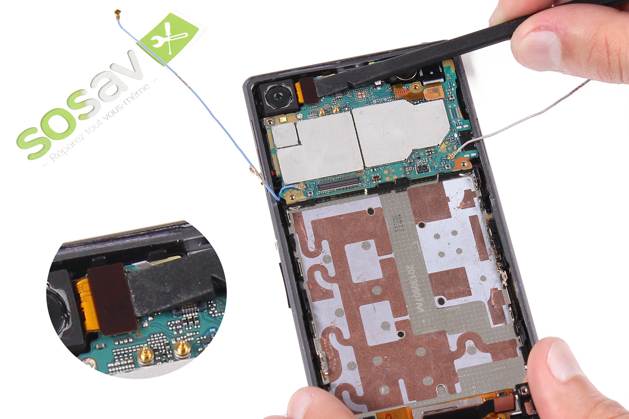 Terminez le décollement de la nappe de liaison gauche en utilisant la spatule en nylon.Saisissez ensuite la nappe via la pince puis procédez à son retrait.