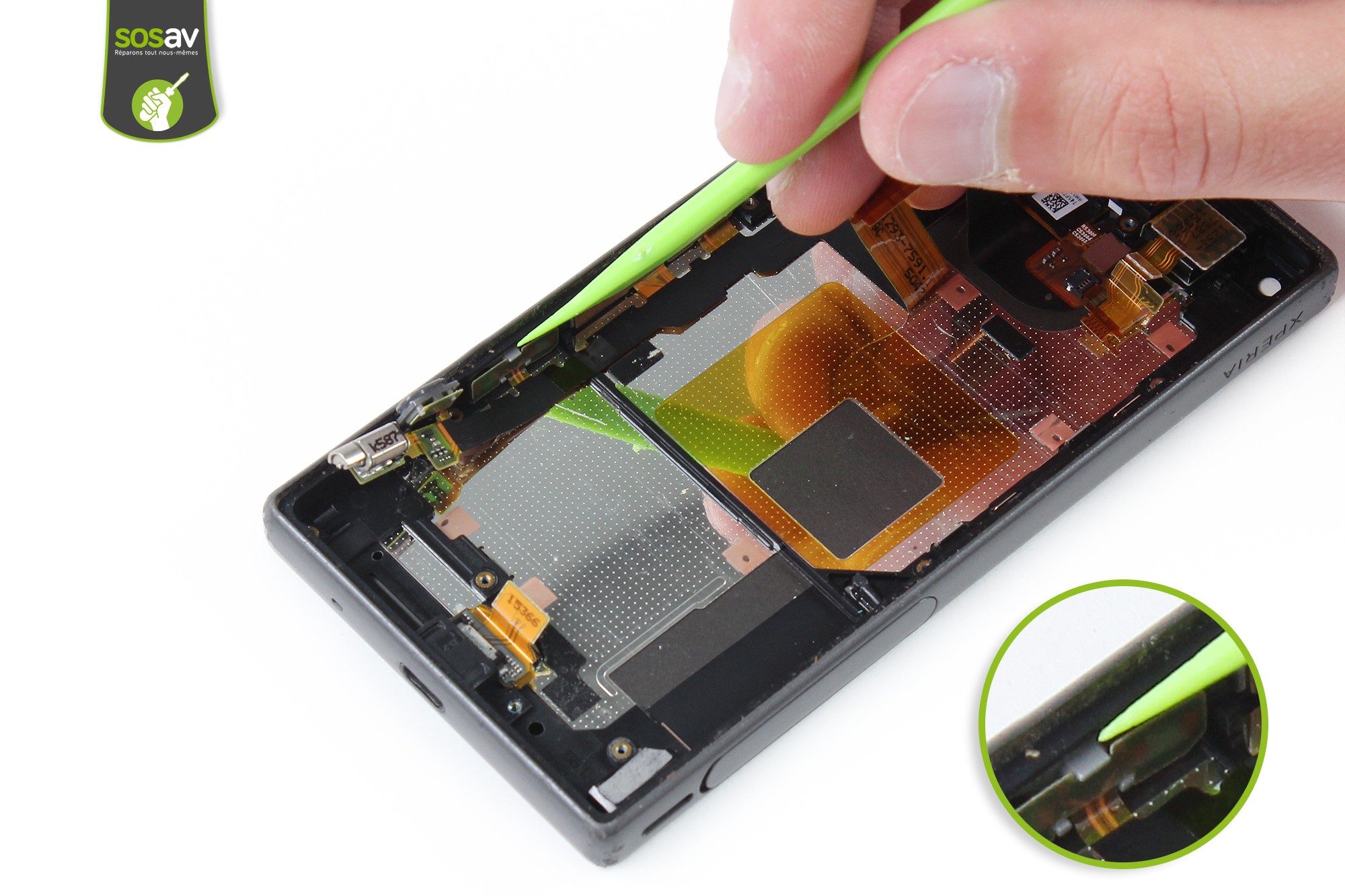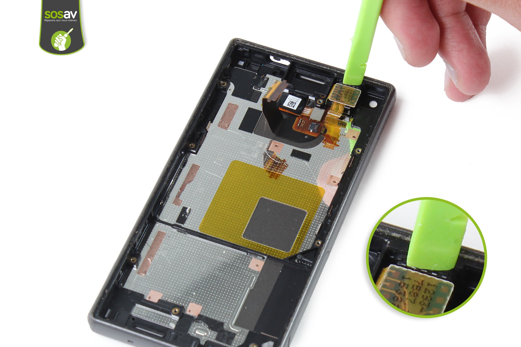 Reprenez la spatule en nylon pour déverrouiller le connecteur de la nappe des boutons latéraux + vibreur puis le connecteur de la nappe de l'écran.