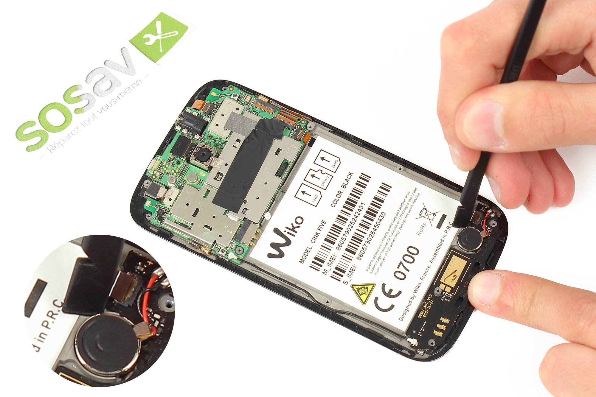 Note : Ne retirez pas le vibreur après l'avoir décollé ! Ce dernier est en effet soudé par deux petits fils colorés à la carte de l'ensemble du bas.