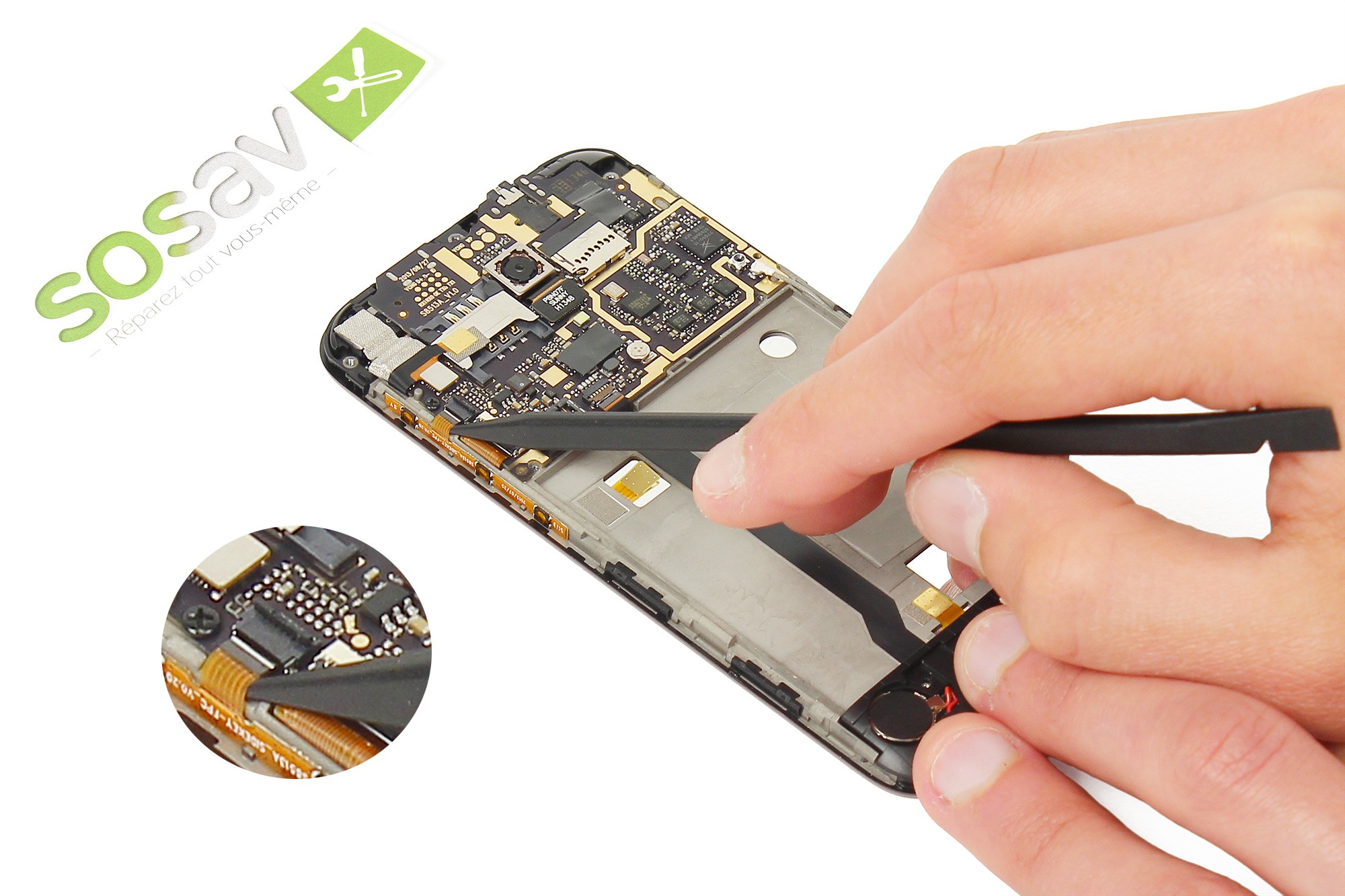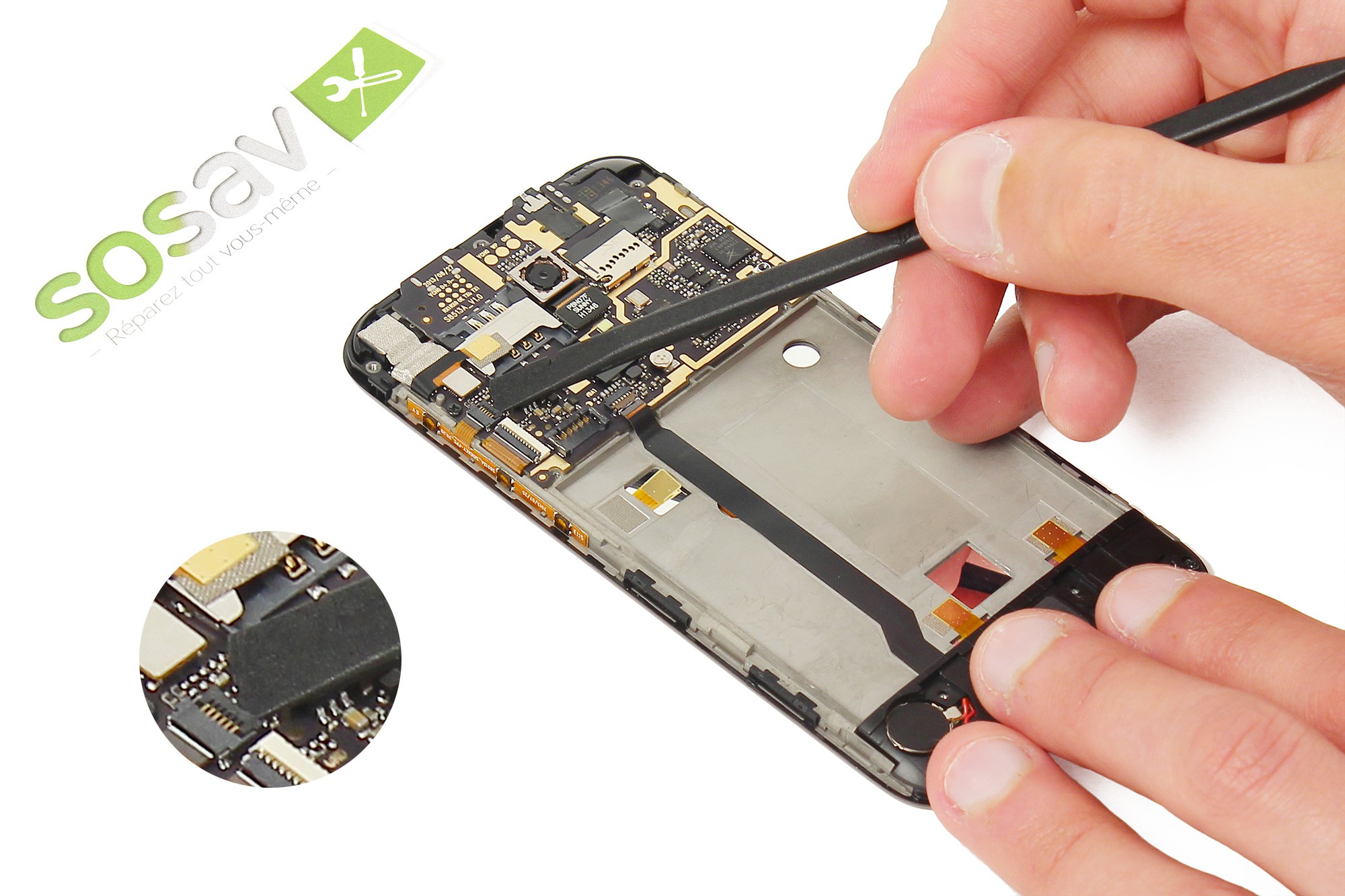 Note : La batterie est collée au châssis du téléphone. Pour ne pas endommager cette dernière, soyez minutieux et ne forcez pas trop.