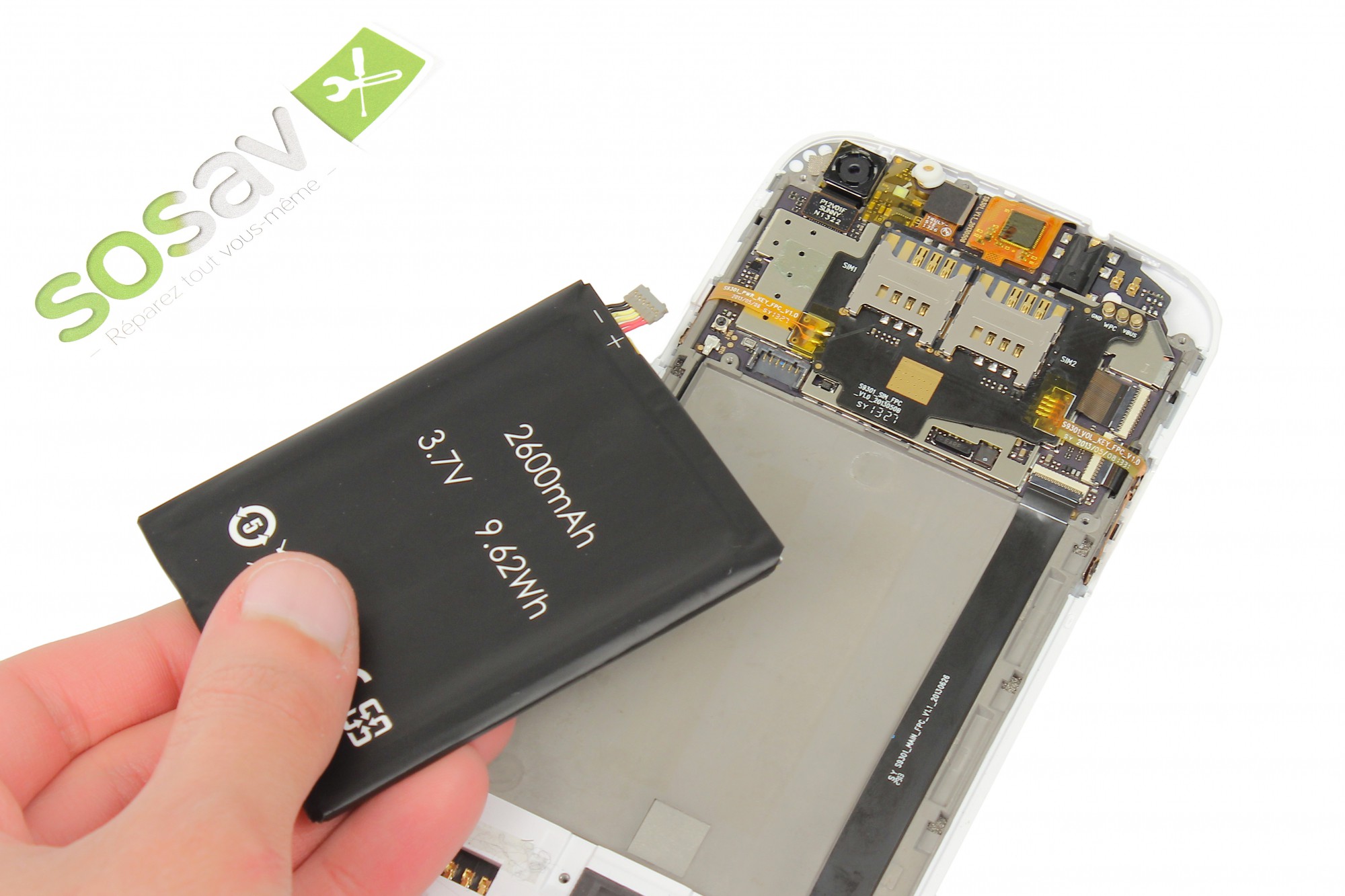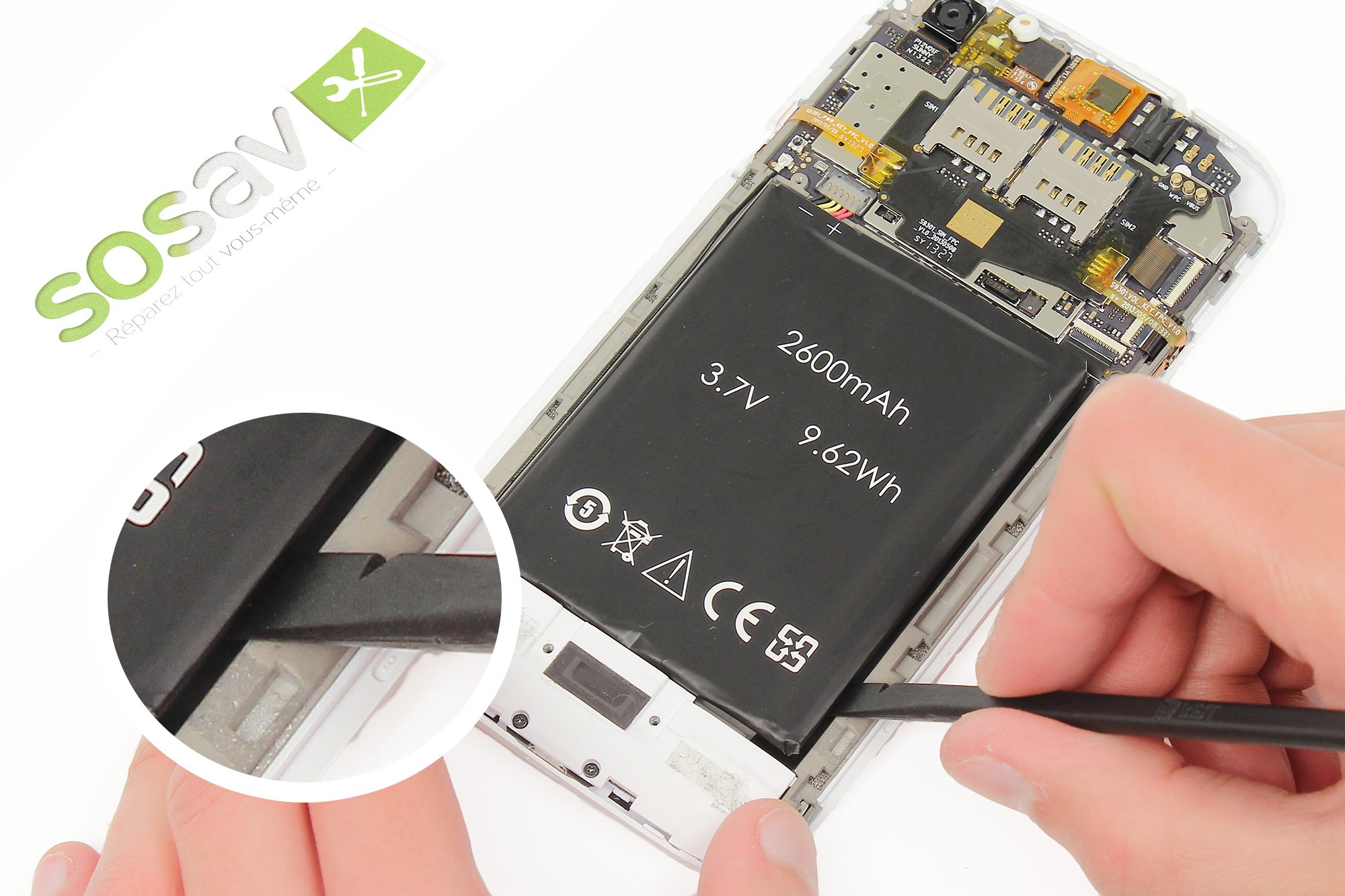 Note : La batterie est collée très fermement au châssis du téléphone ! Soyez minutieux lors de cette opération afin de ne pas endommager cette dernière.