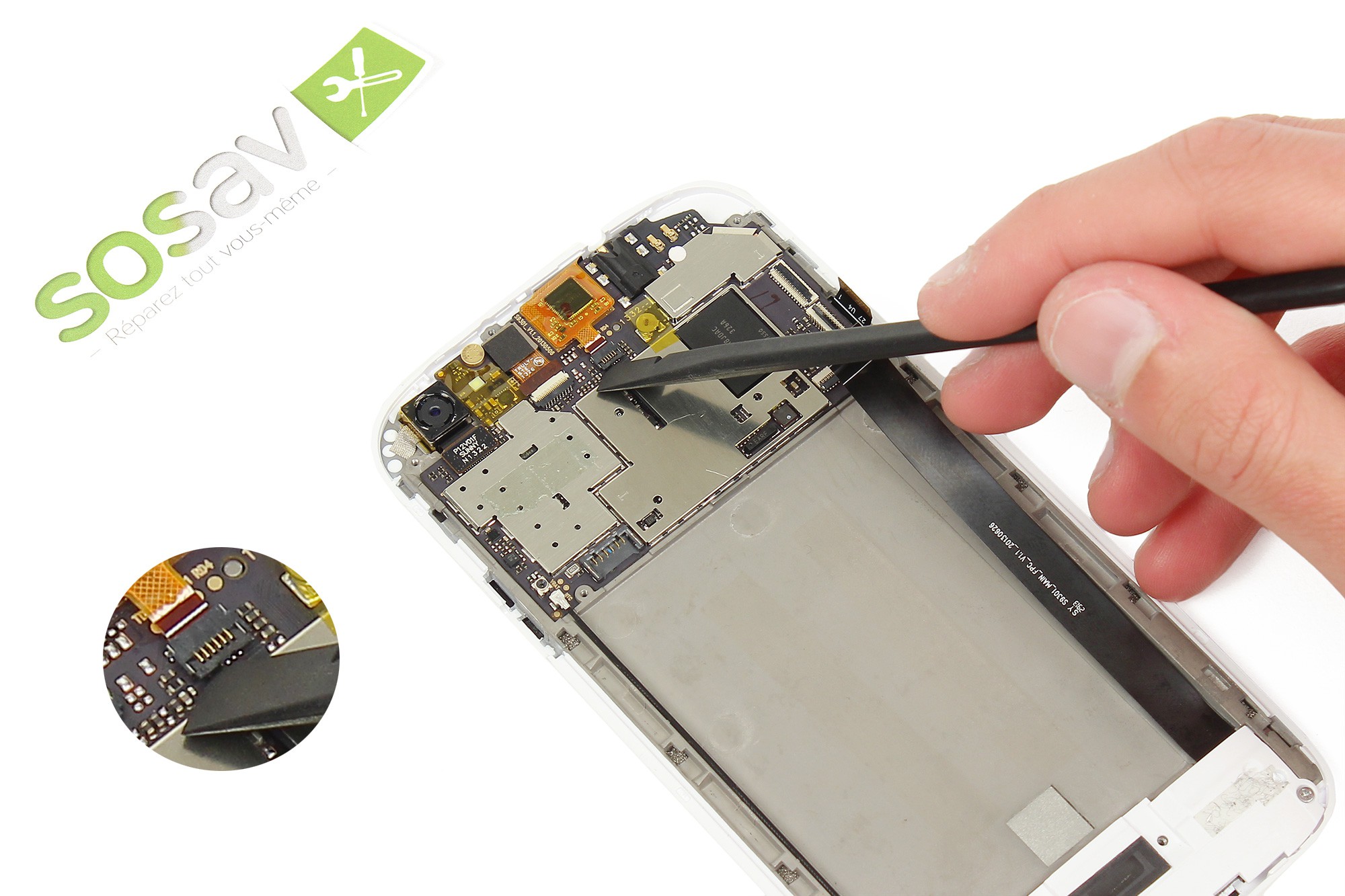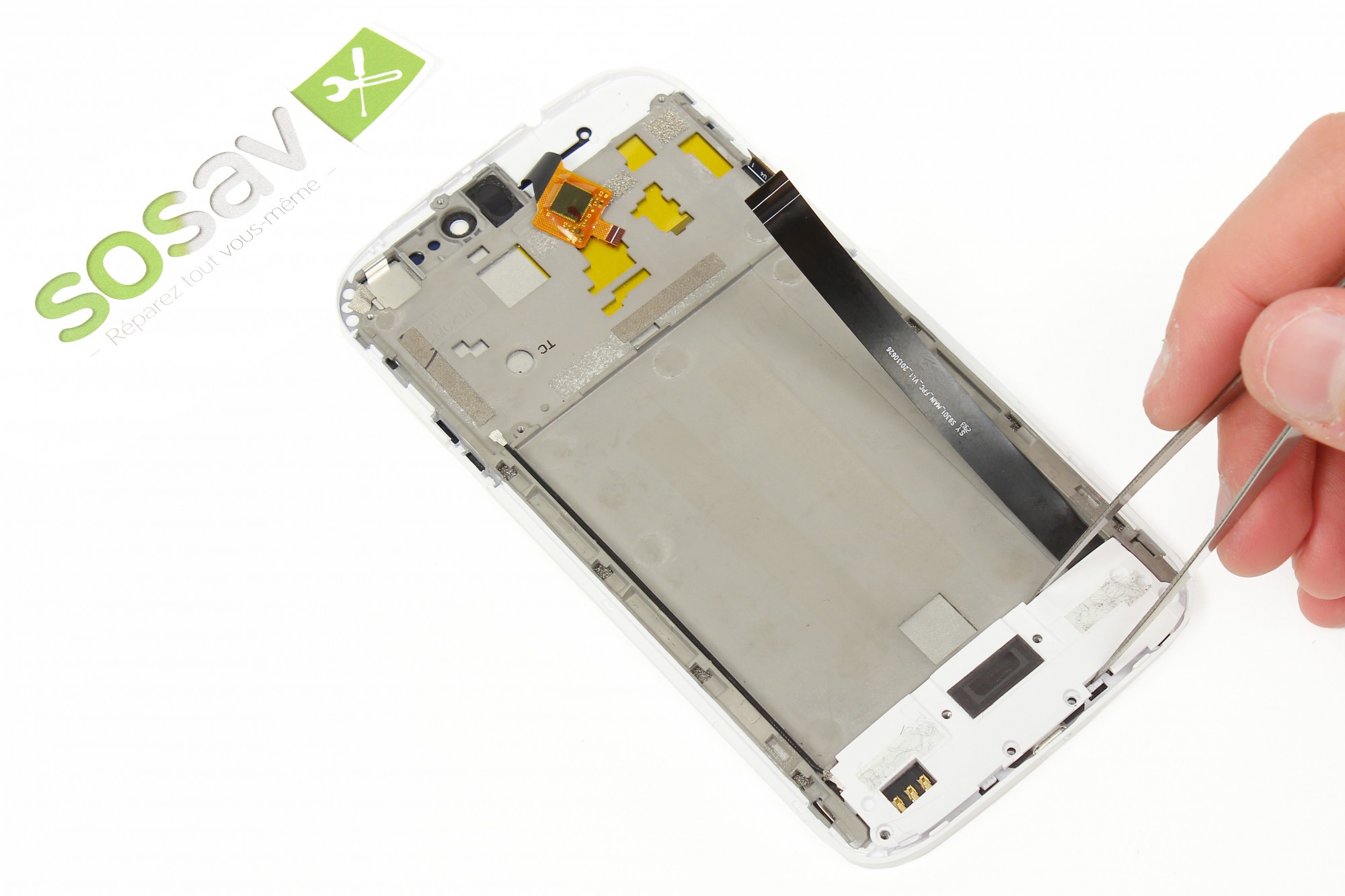 Sortez la nappe du lecteur SIM et microSD de son logement en vous aidant de la pointe de la spatule.
