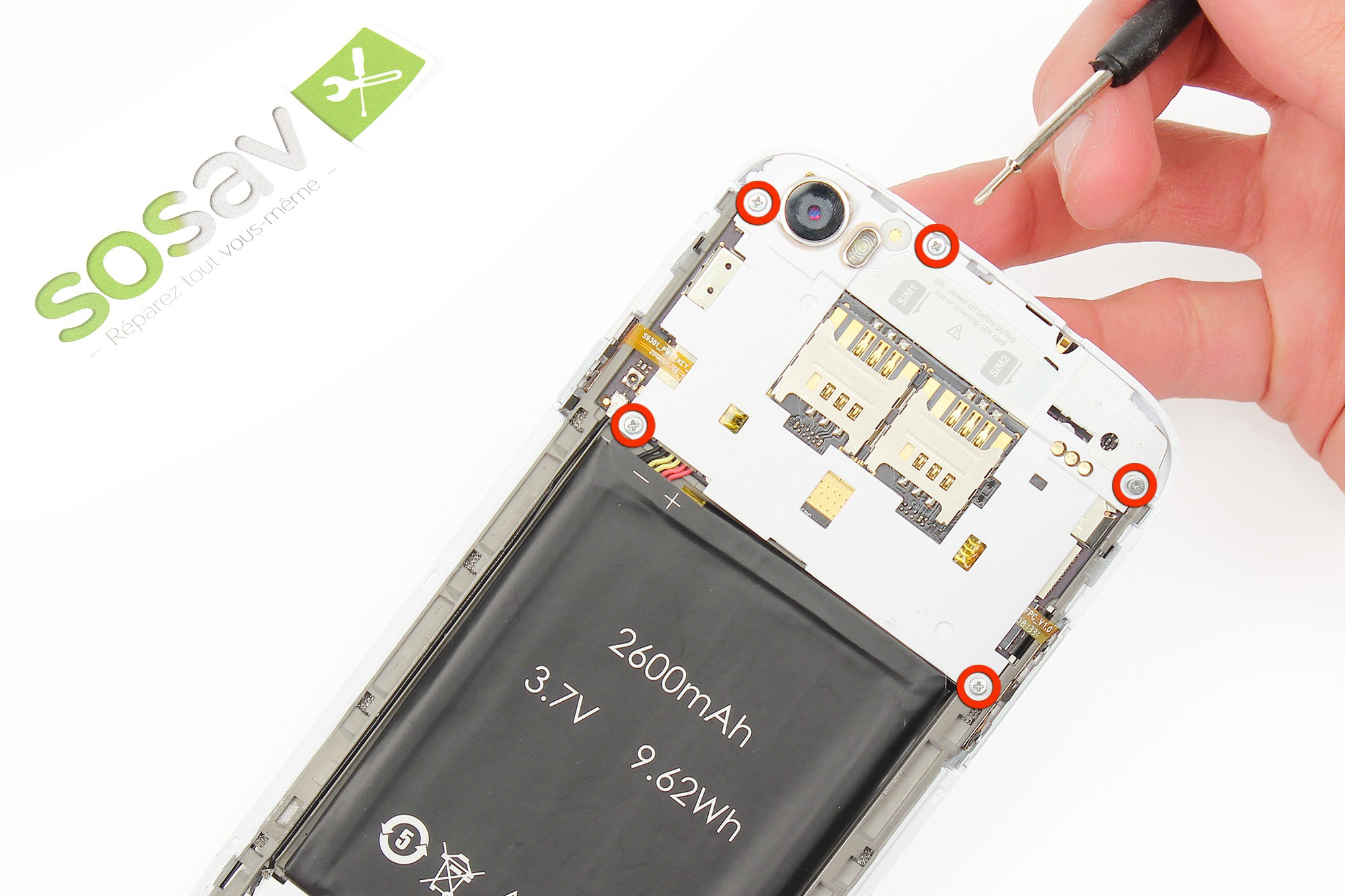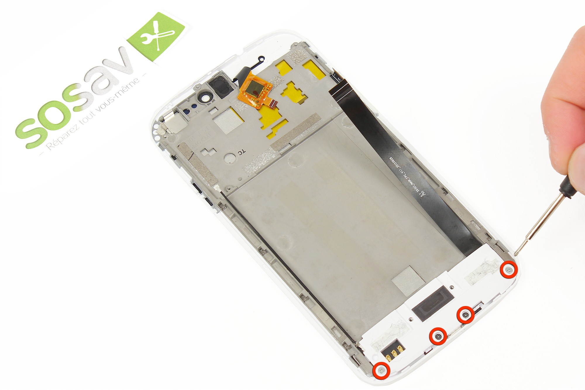 Avec le tournevis cruciforme, dévissez les cinq vis entourées en rouge sur la photo.