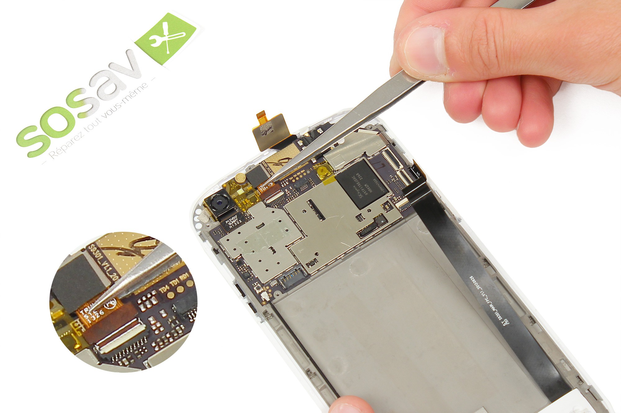 Retirez le câble d'interconnexion de son logement en utilisant la spatule en nylon.