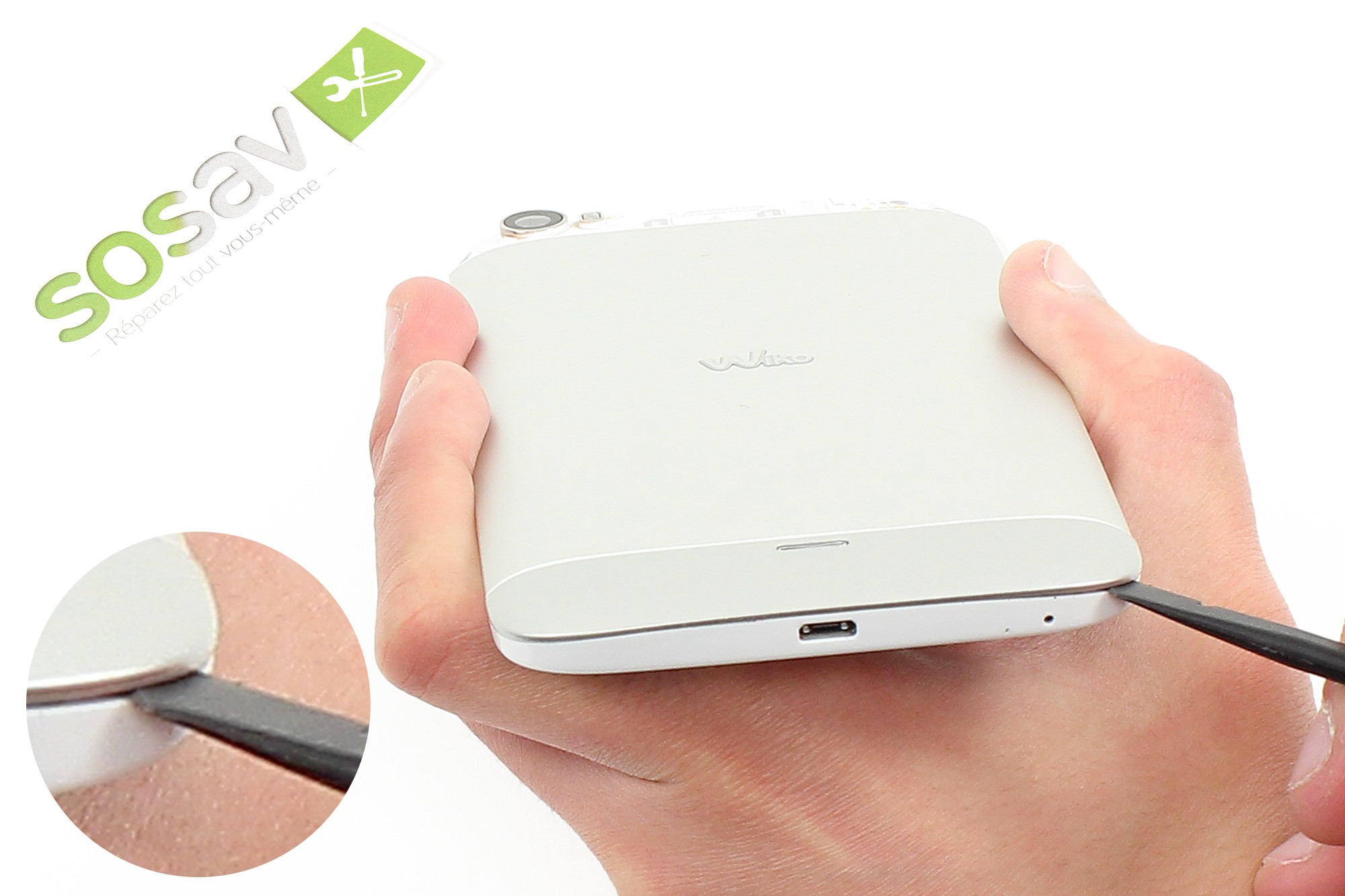 Pour cela,insérez la spatule dans l'interstice entre le cache du bas et le châssis du téléphone comme indiqué sur les photos.