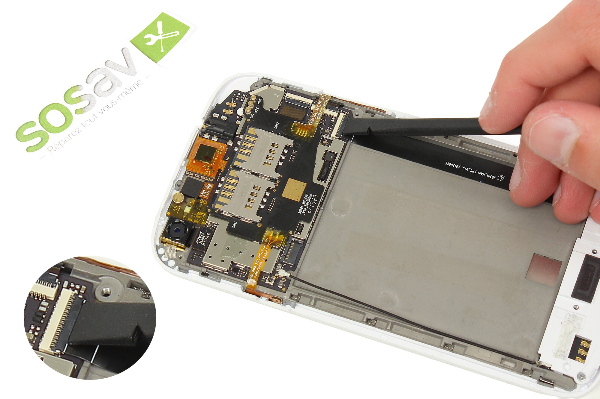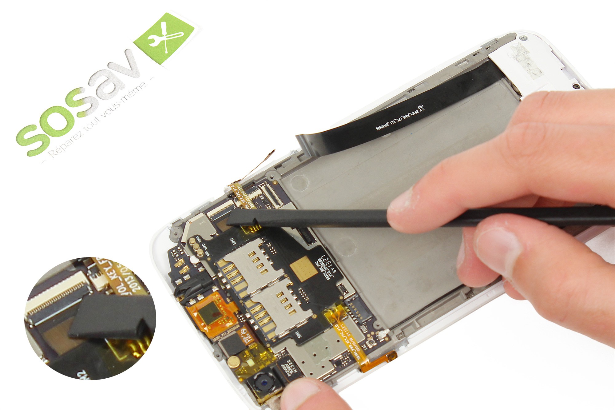 Utilisez la pointe de al spatule afin de retirer la nappe de liaison du connecteur.
