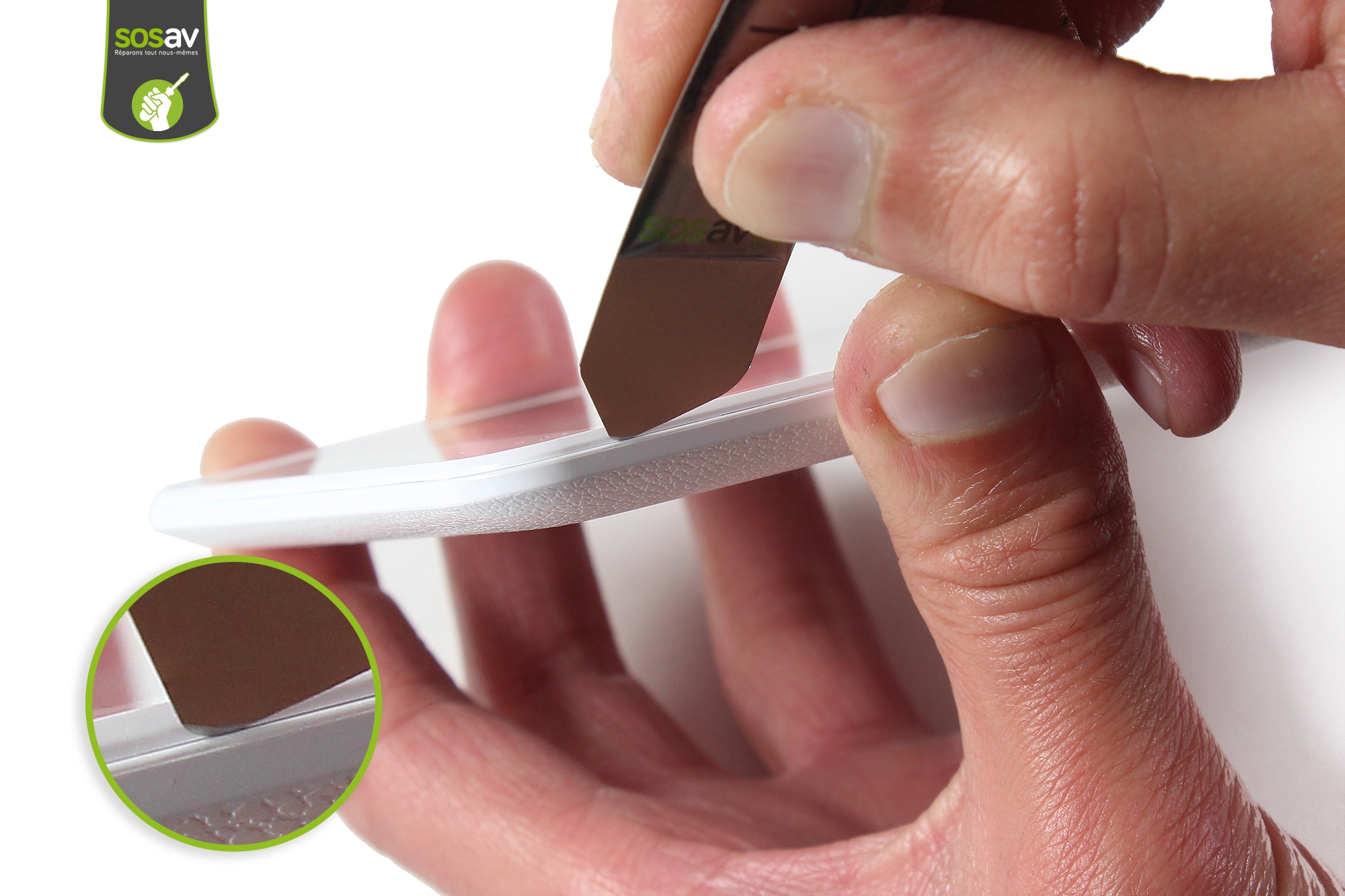 Faites levier pour déclipser la coque. Répetez le mouvement de chaque côté de l'appareil.