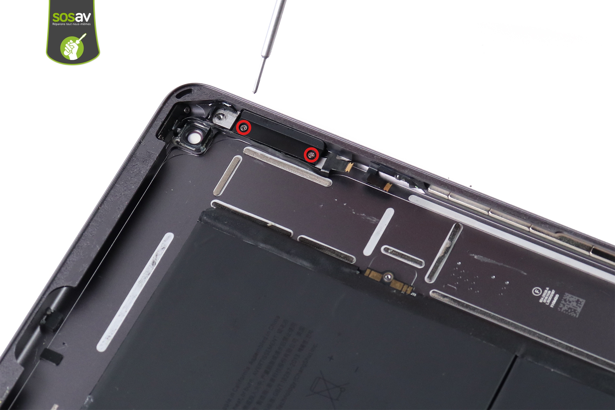 Dévissez ensuite la vis cruciforme entourée en rouge. (Photo 1)Calez un médiator sous le connecteur afin de le soulever et couper le contact de la batterie.Cela évitera les éventuels courts-circuits lors de la suite de la réparation iPad 7.La batterie n'a pas de nappe mais un simple connecteur qui fait contact avec la carte mère. Avec cette méthode, pas besoin de retirer entièrement la batterie ;)