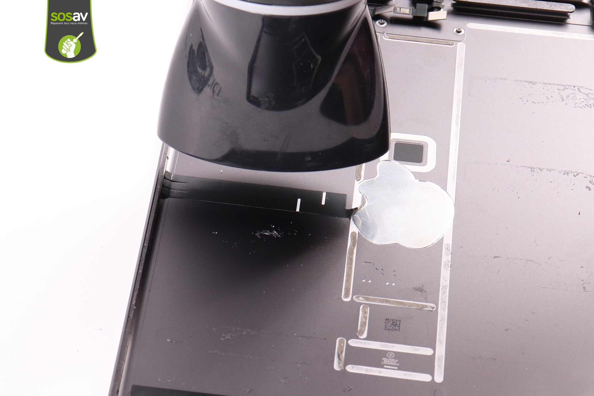 Pour décoller la batterie, il faut chauffez la zone où se situe la batterie par l'arrière de l'appareil avec un sèche cheveux.Il ne faut jamais chauffer la batterie directement, c'est pourquoi on passe par l'arrière.