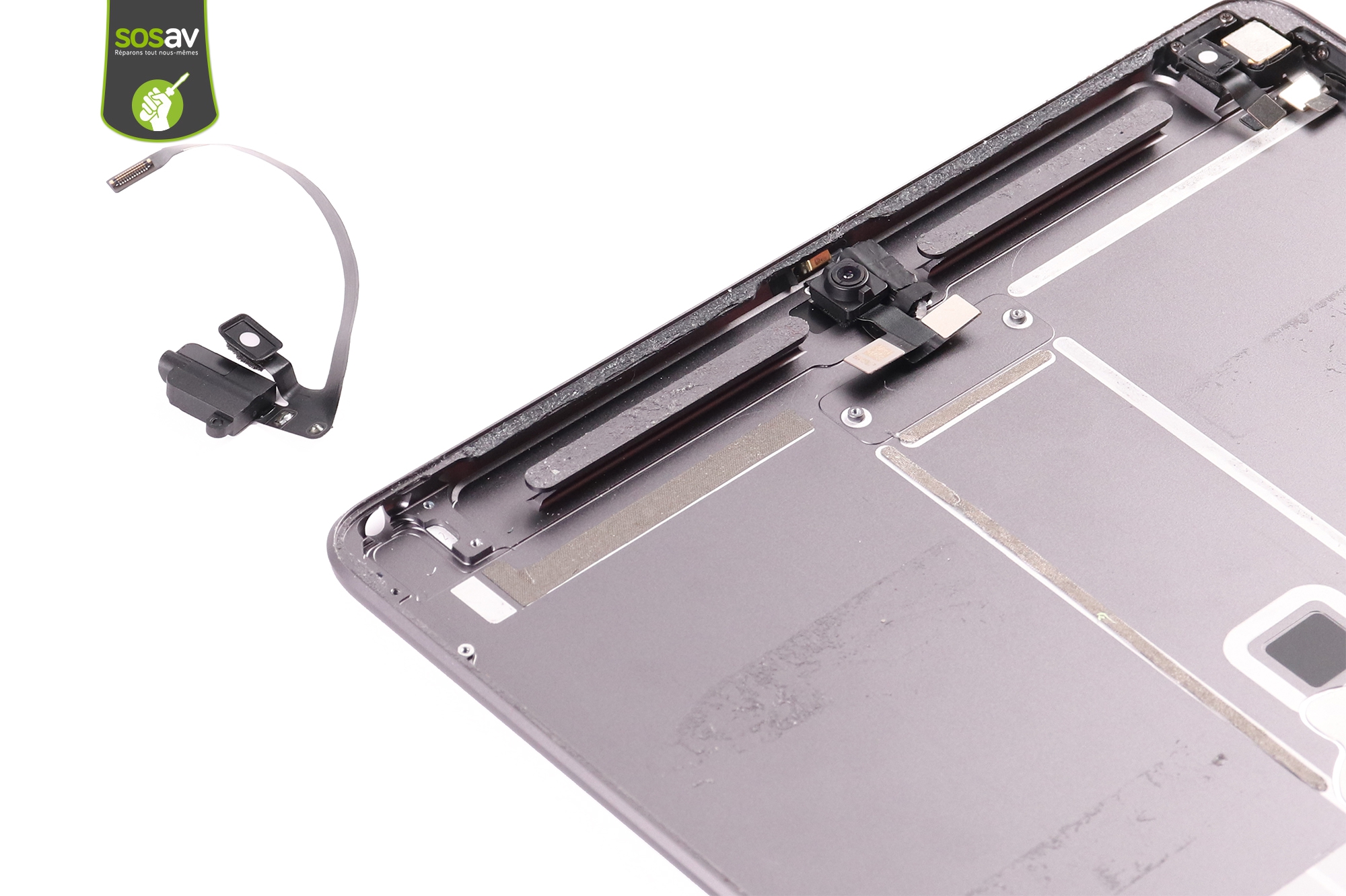 Ensuite déconnectez les nappes de liaison de la caméra avant, du micro et de la prise jack.