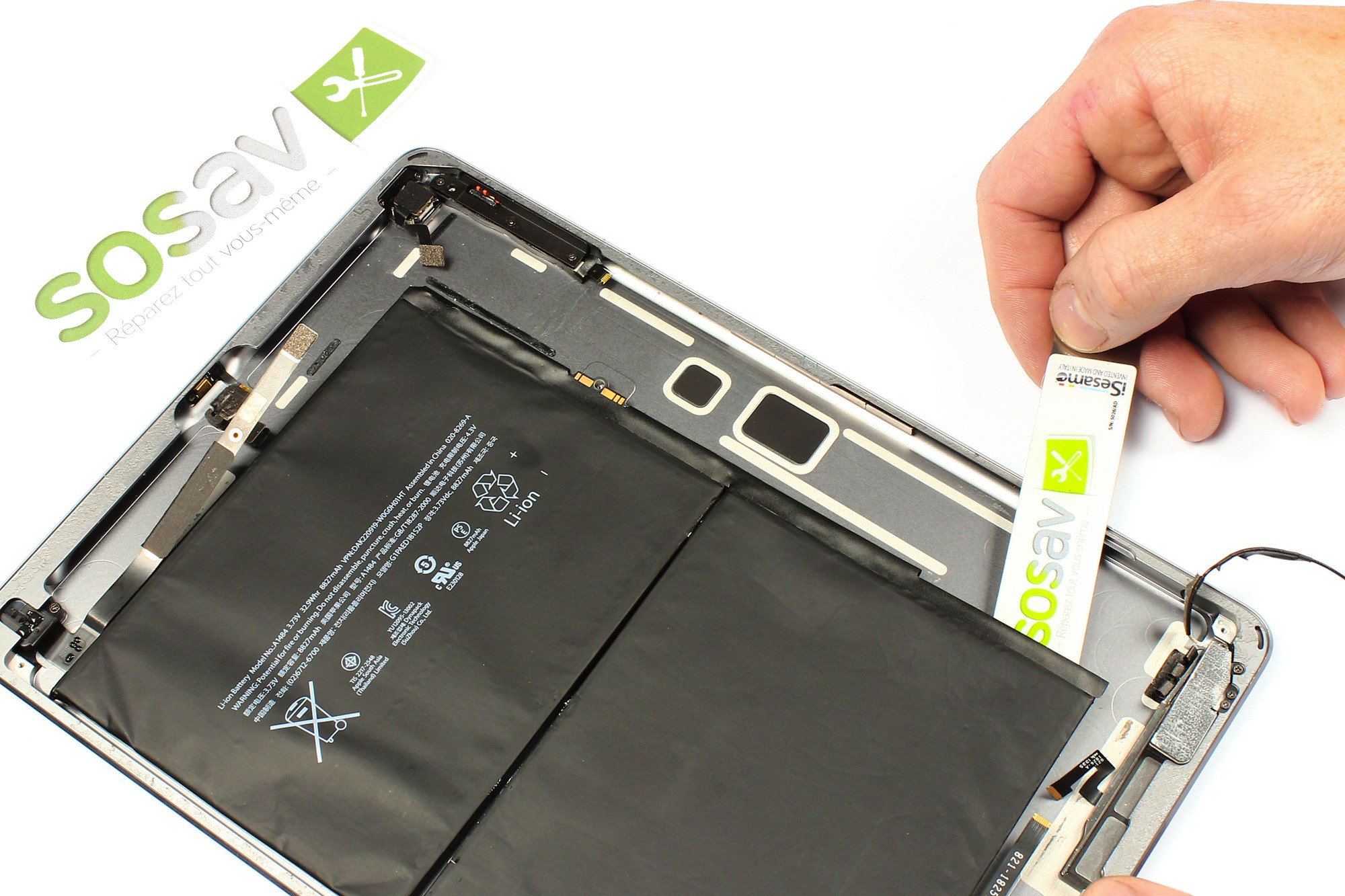 Avec la spatule en metal iSesamo, venez décoller la batterie du châssis de l'iPad Air.