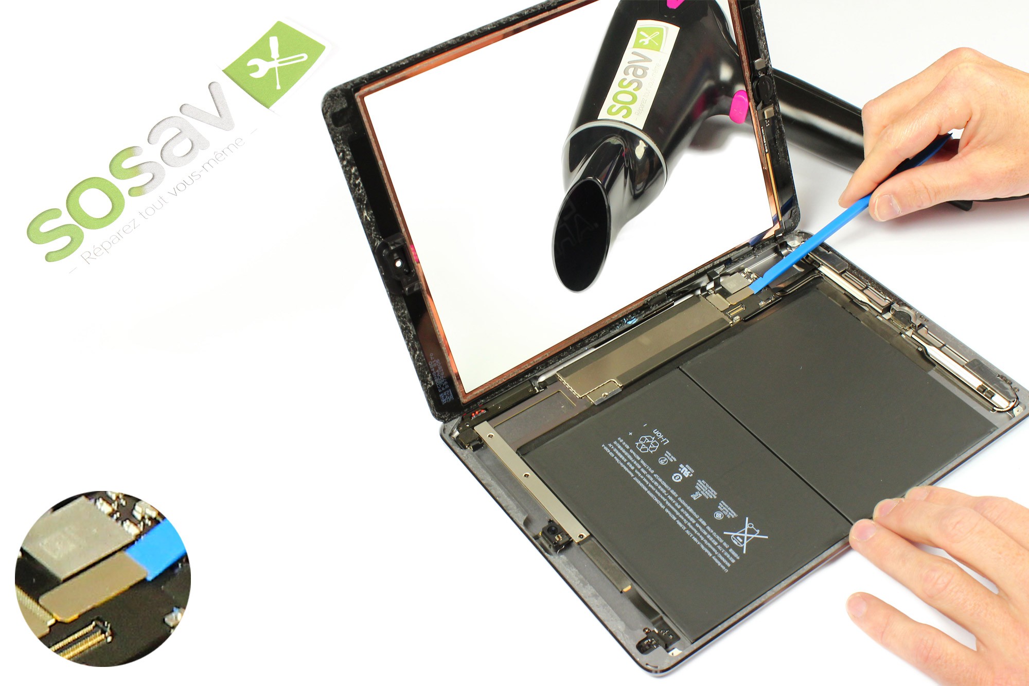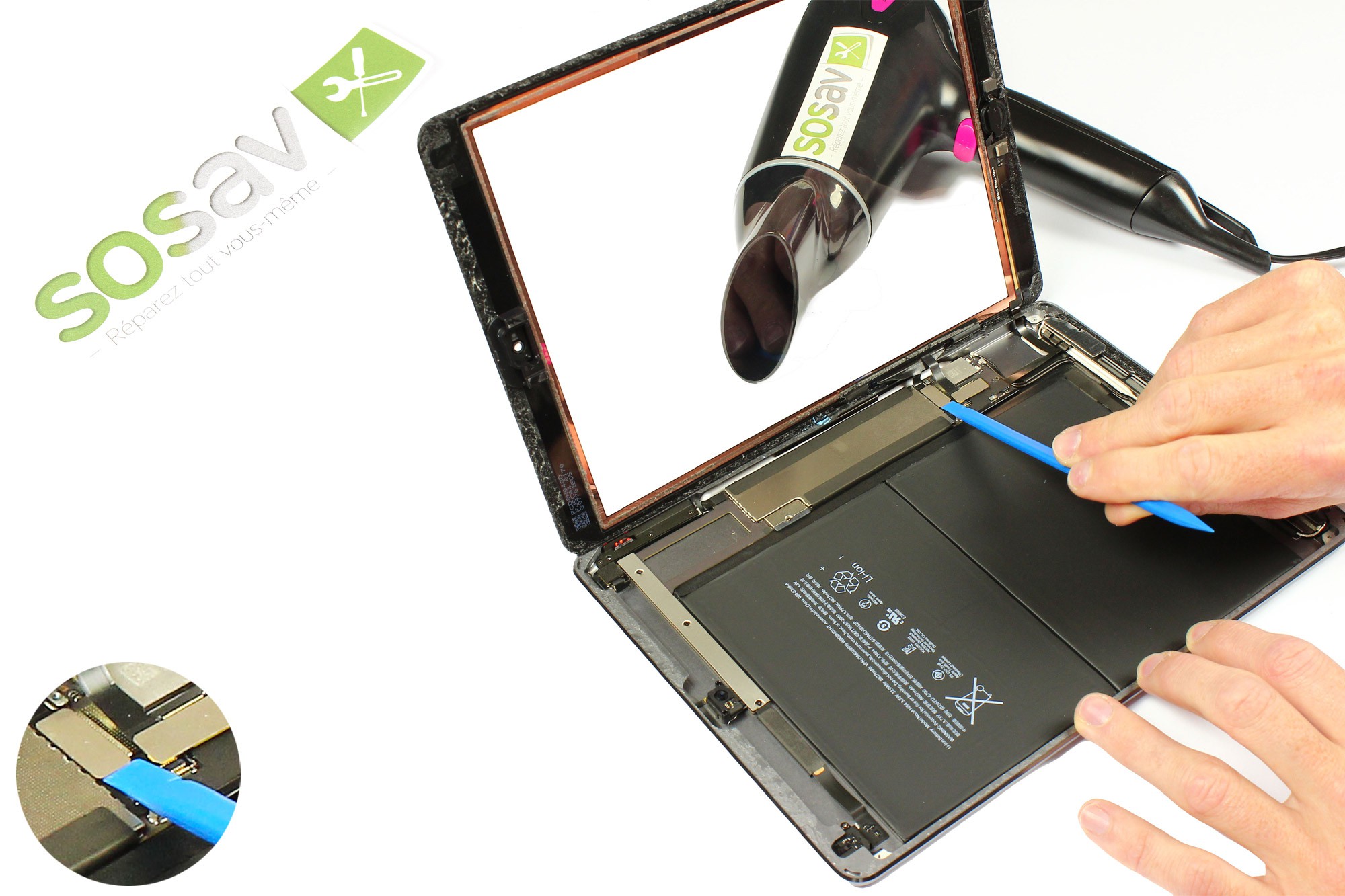 CONSEIL : Pour ne pas abimer les nappes de la vitre tactile, re-utilisez votre sèche-cheveux comme support pour la maintenir à 90°.