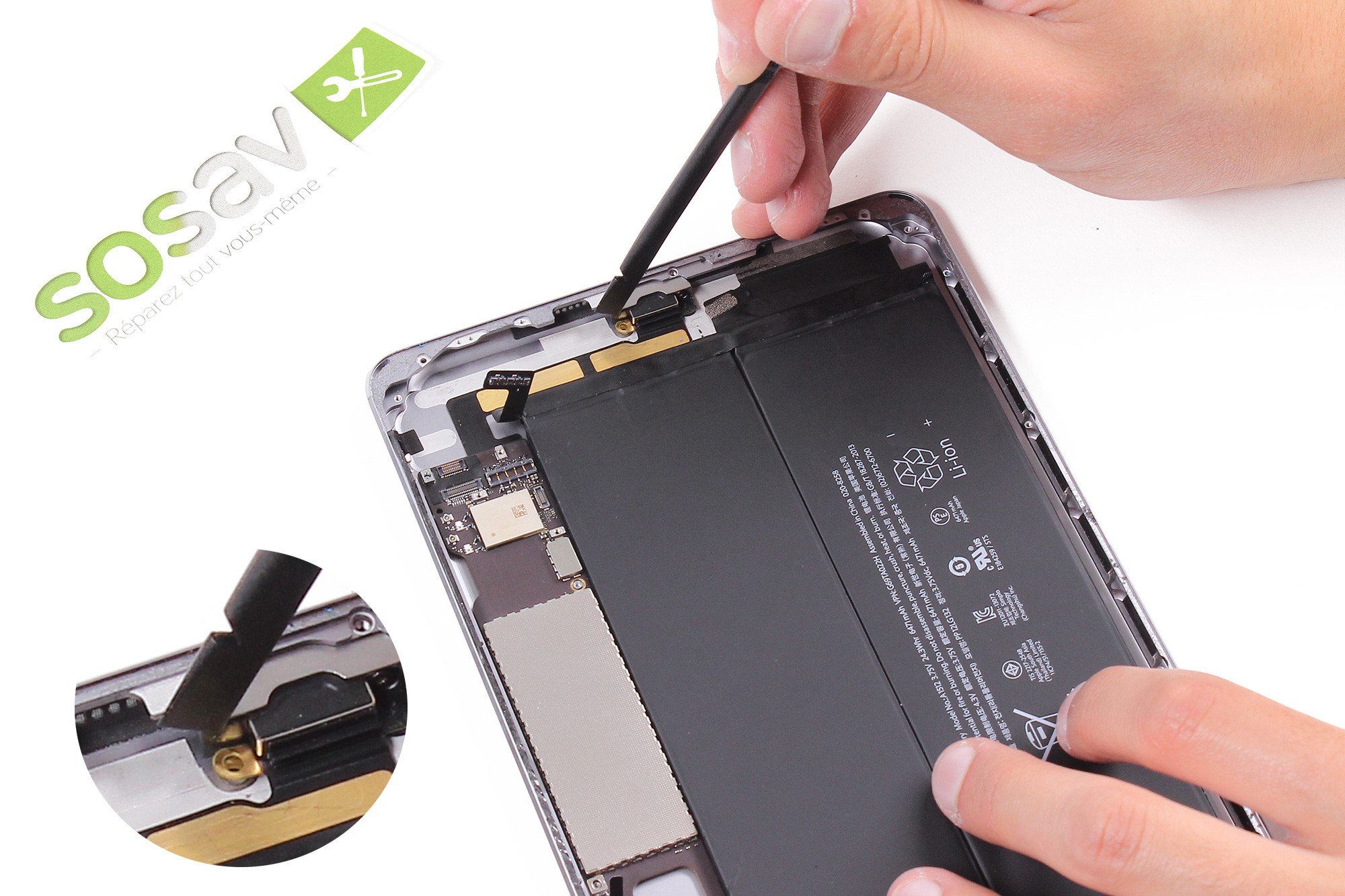 Avec ce tournevis cruciforme, dévissez la vis entourée en rouge.Cette vis sert à maintenir le haut-parleur gauche sur le châssis de l'iPad.Déclipsez ensuite le haut-parleur gauche à l'aide d'une spatule iSesamo.
