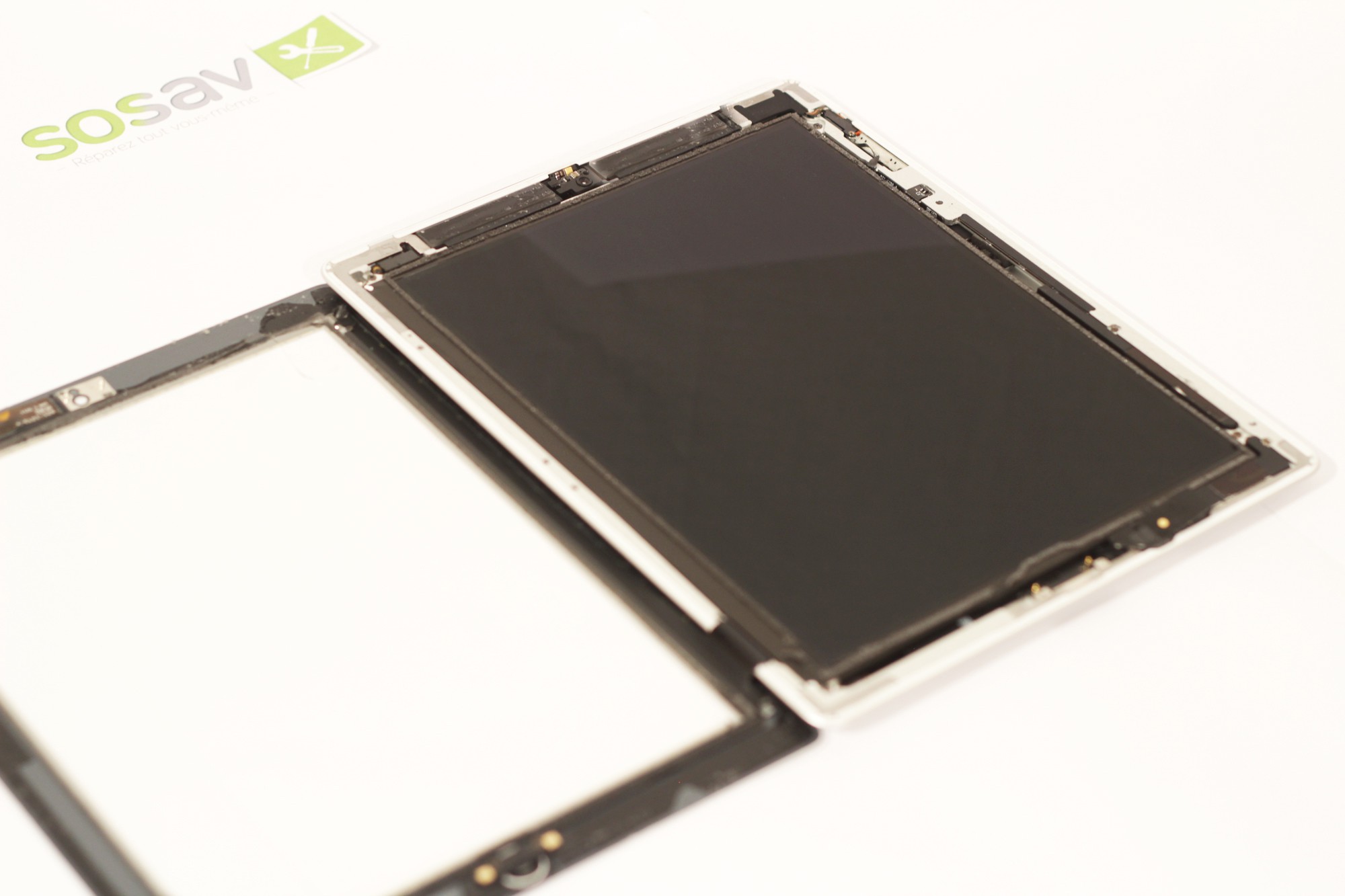 Soulevez désormais l'écran LCD pour le placer dans la dalle tactile à gauche de votre iPad 2.si vous avez du mal à soulever l'écran LCD, utilisez une spatule en nylon pour faire levier au niveau de la fixation de la vis inférieur droite.