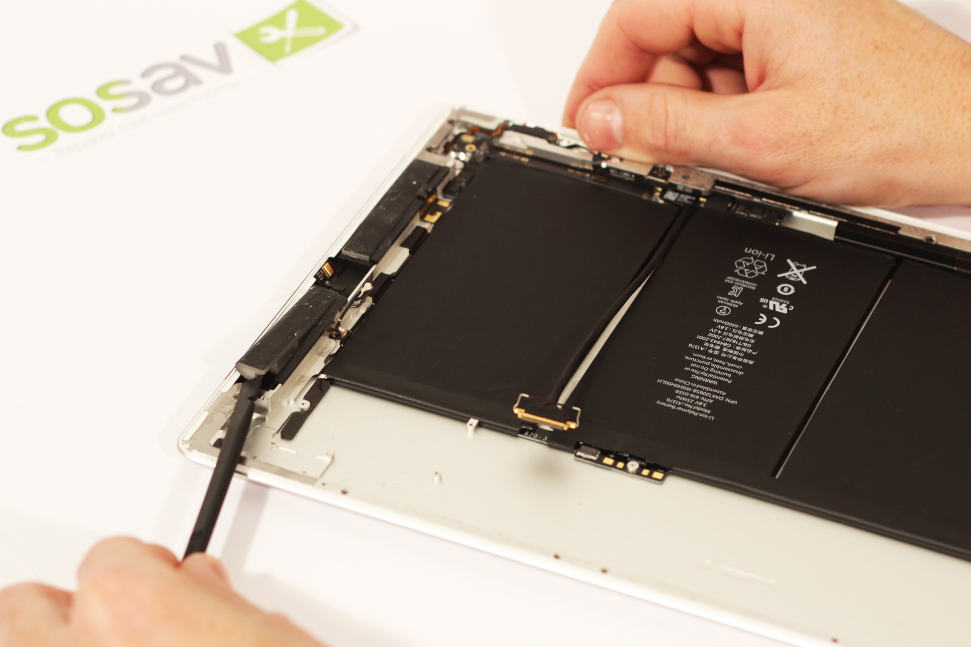 Répétez l'opération sur la partie haute de votre iPad 2 3G.Sur la partie haute de votre iPad 2 3G ce situent les antennes GSM & GPS. Nous vous conseillons alors d'utiliser seulement le médiator sans la spatule en métal pour décoller cette partie sans les endommager.N'hésitez pas à réchauffer votre vitre tactile si vous avez besoin de trop forcer.