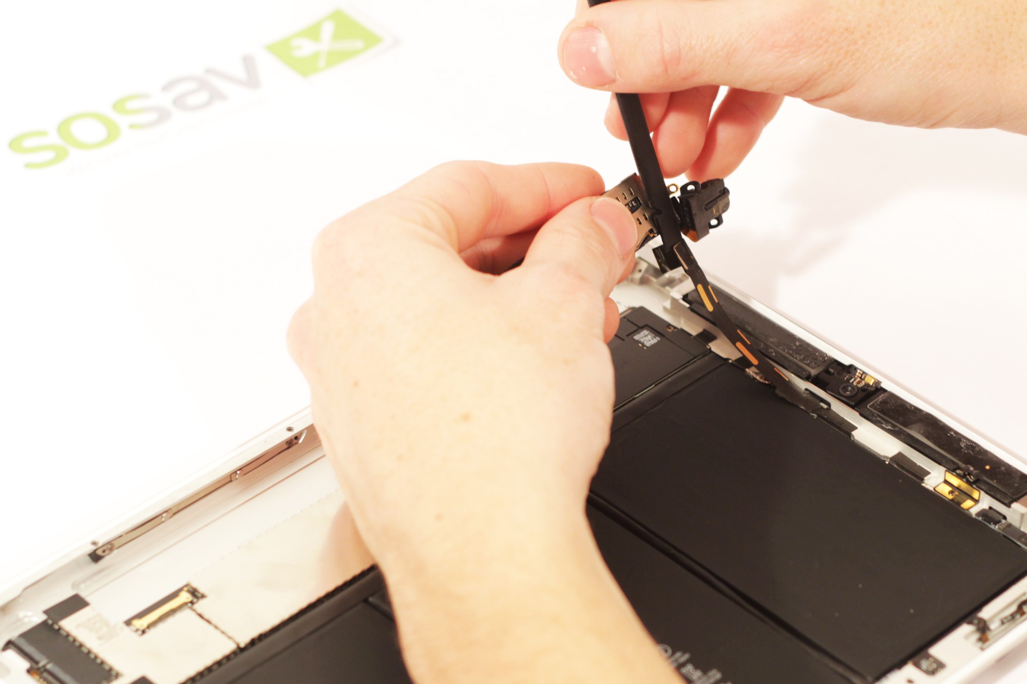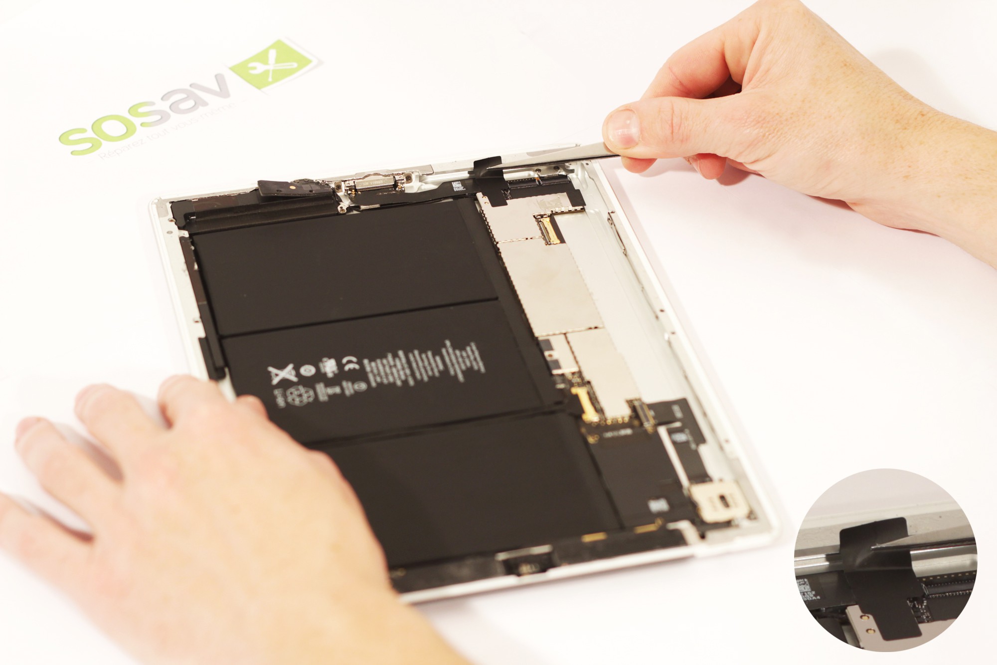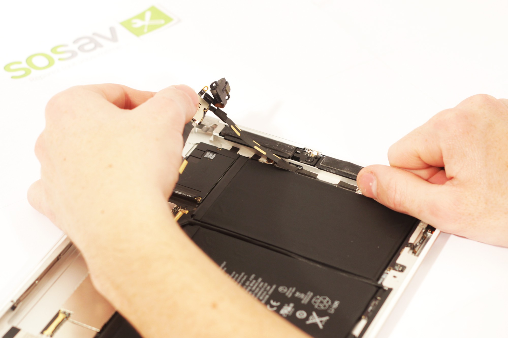 Deconnectez désormais, grâce à une spatule en nylon, la nappe gérant les haut-parleurs de la carte mère de votre iPad 2.