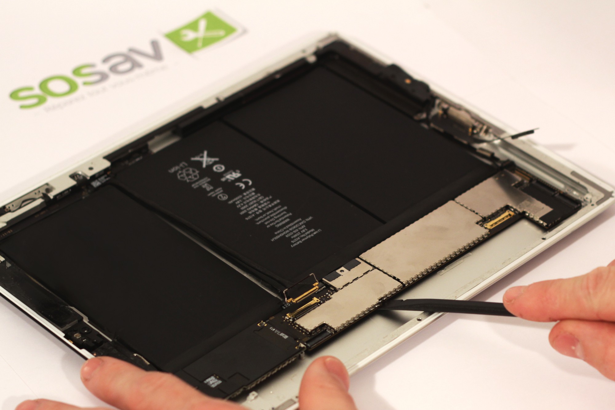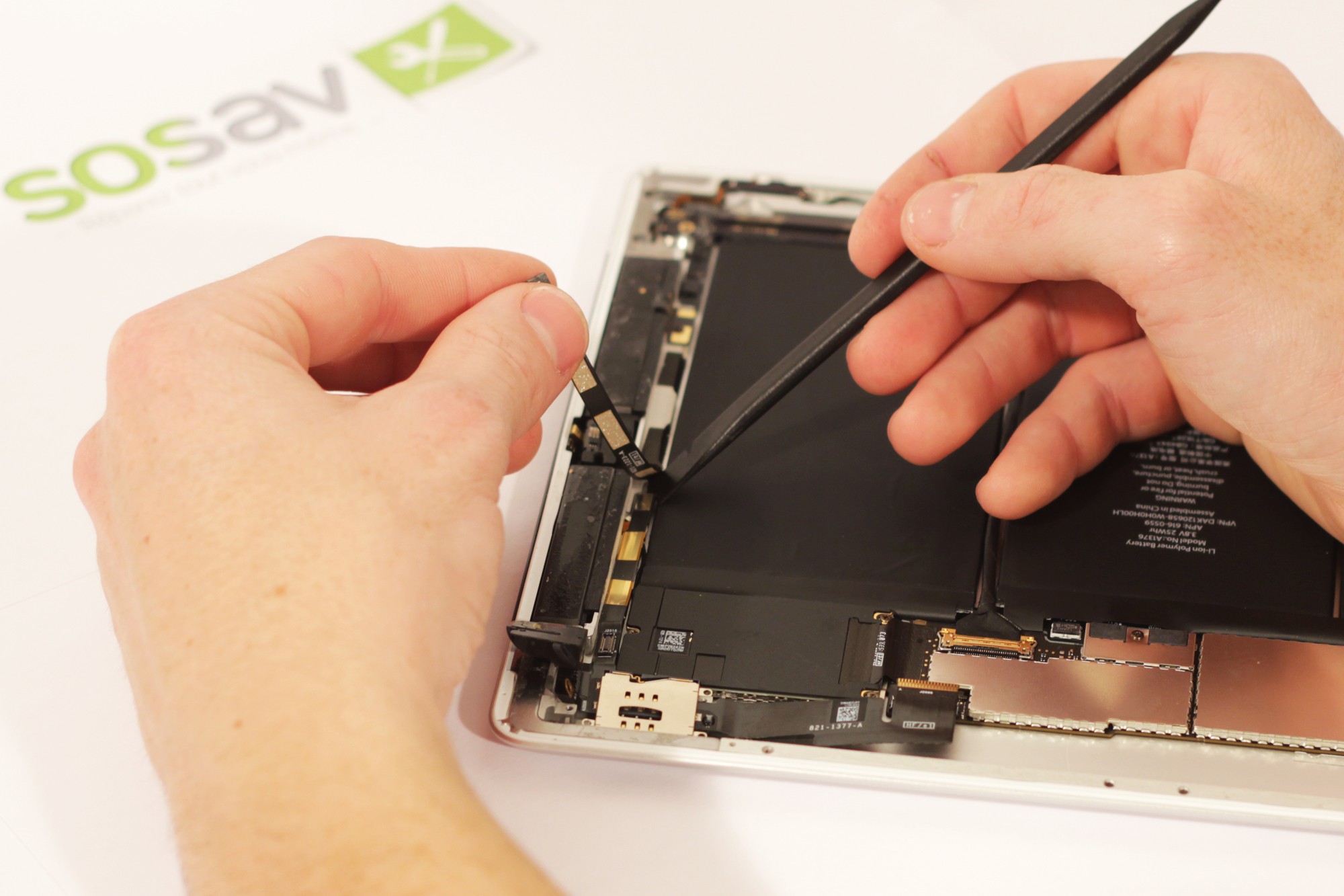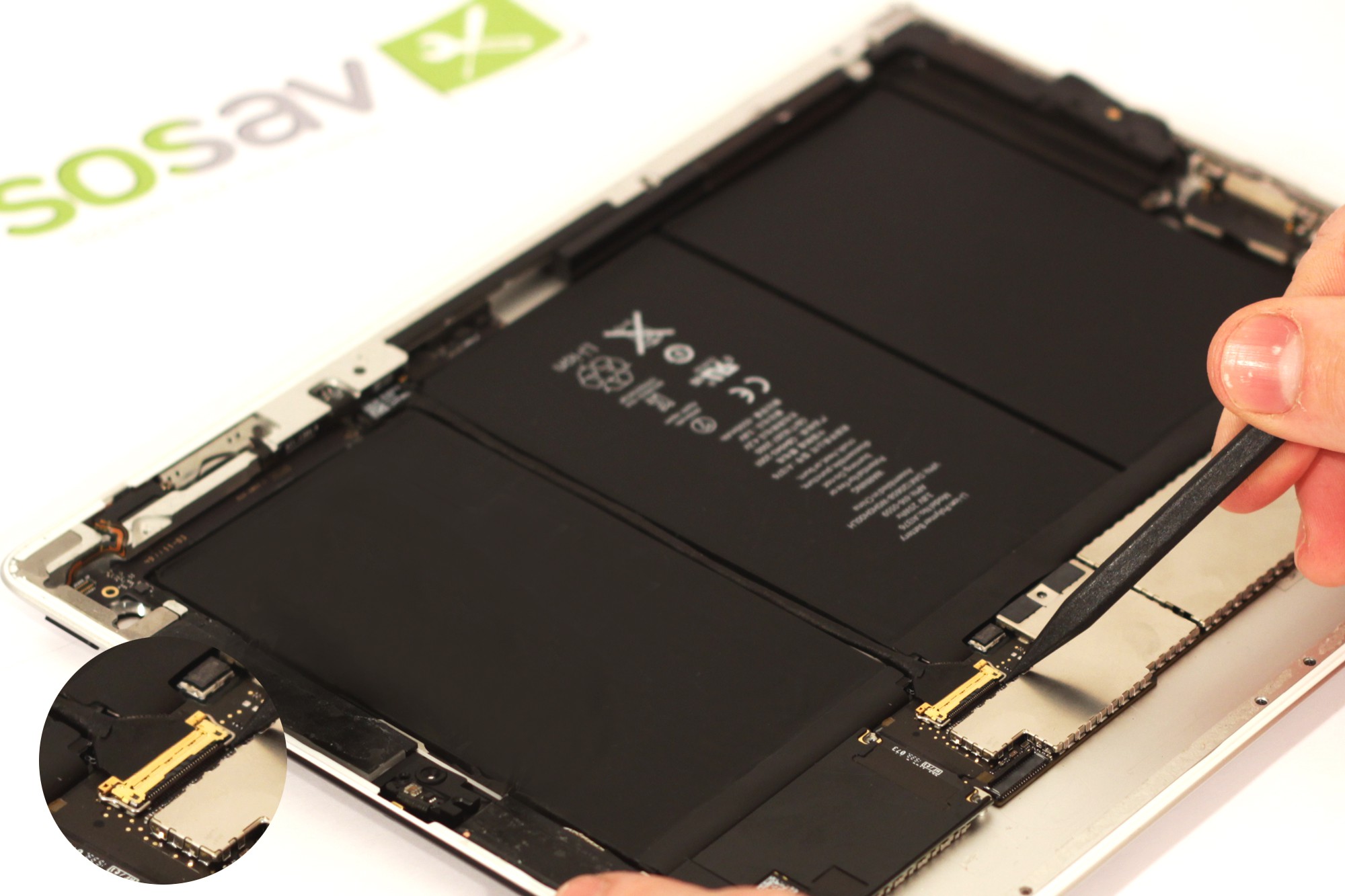 Deconnectez désormais, grâce à une spatule en nylon, la nappe gérant les haut-parleurs de la carte mère de votre iPad 2.