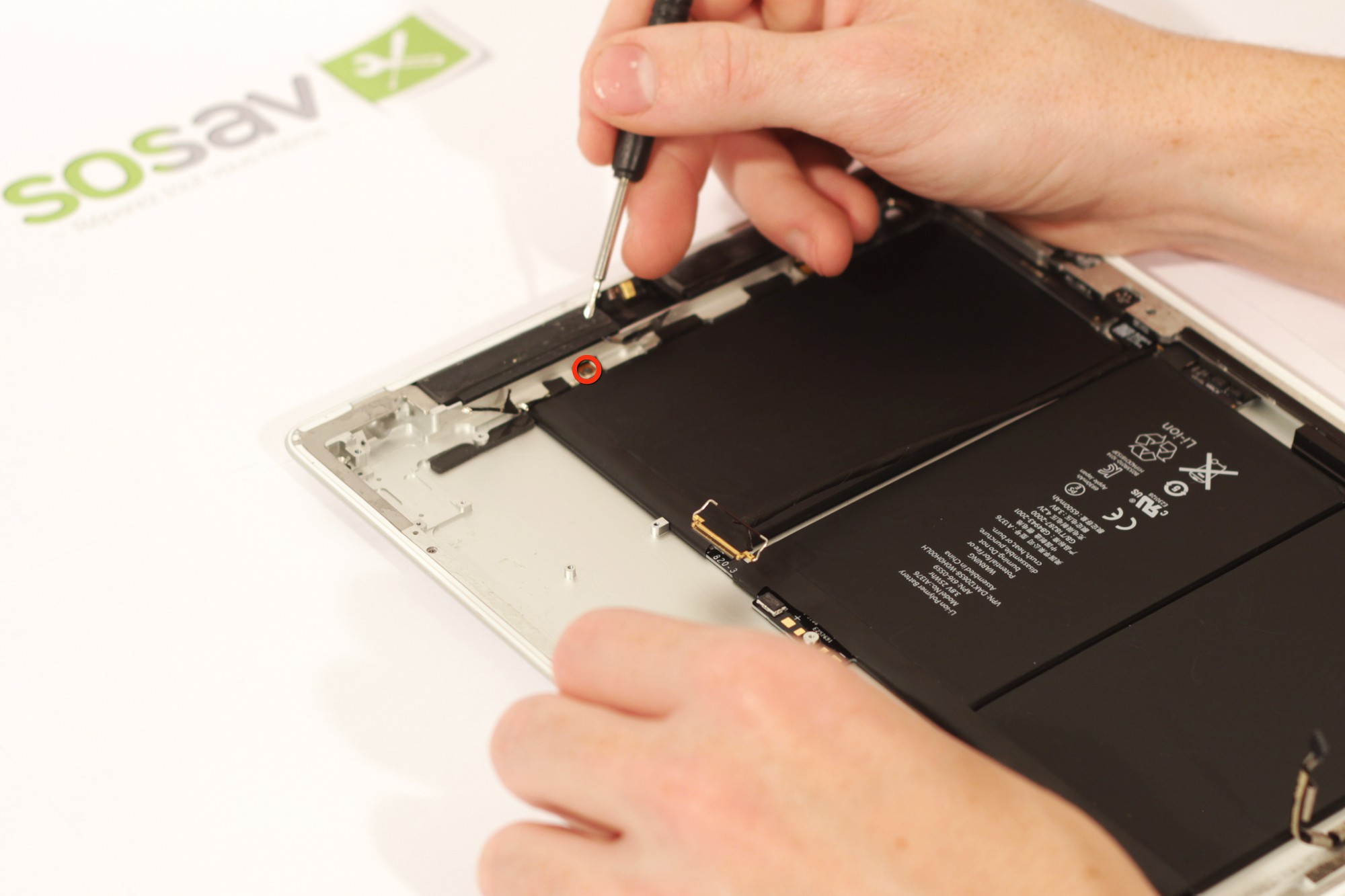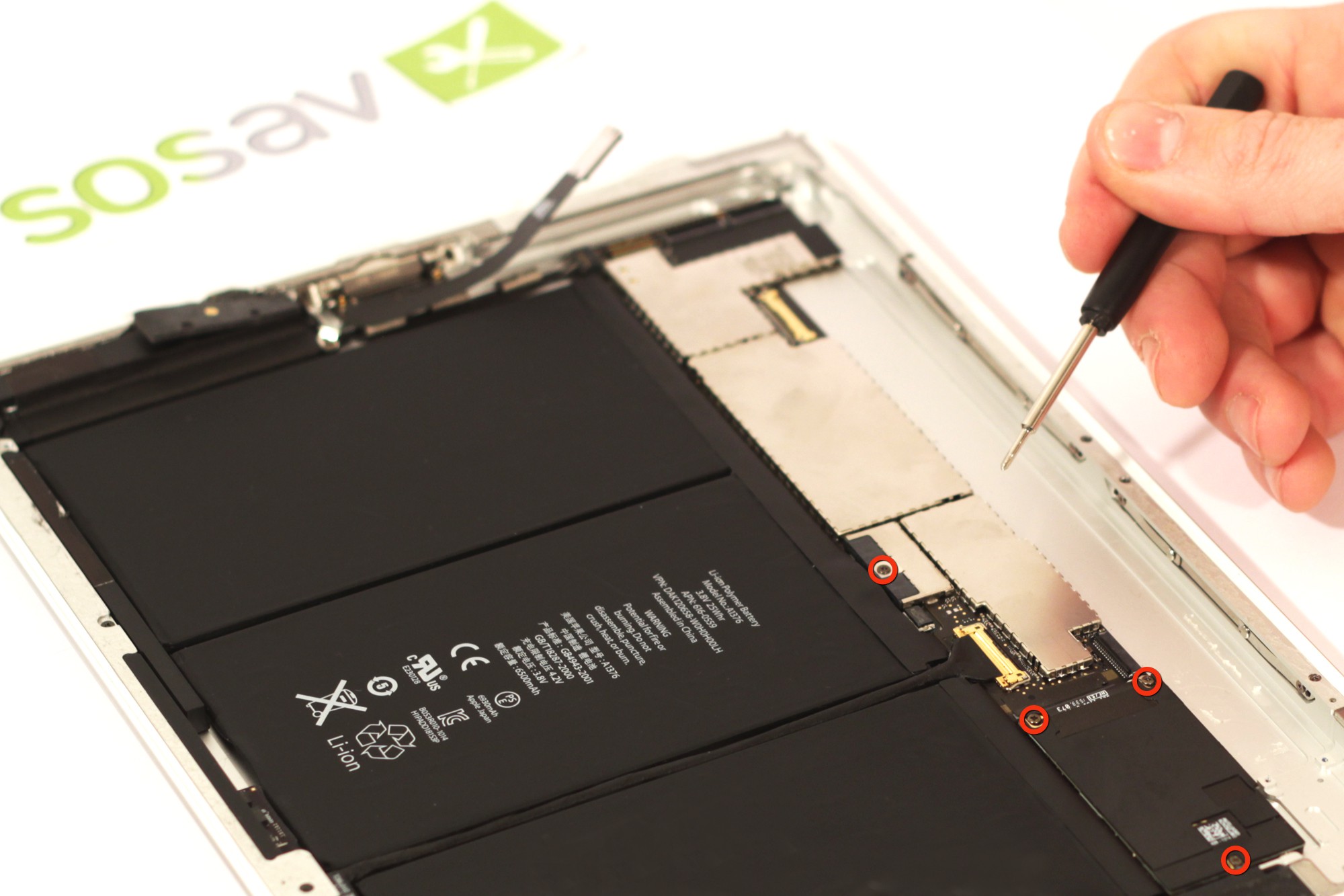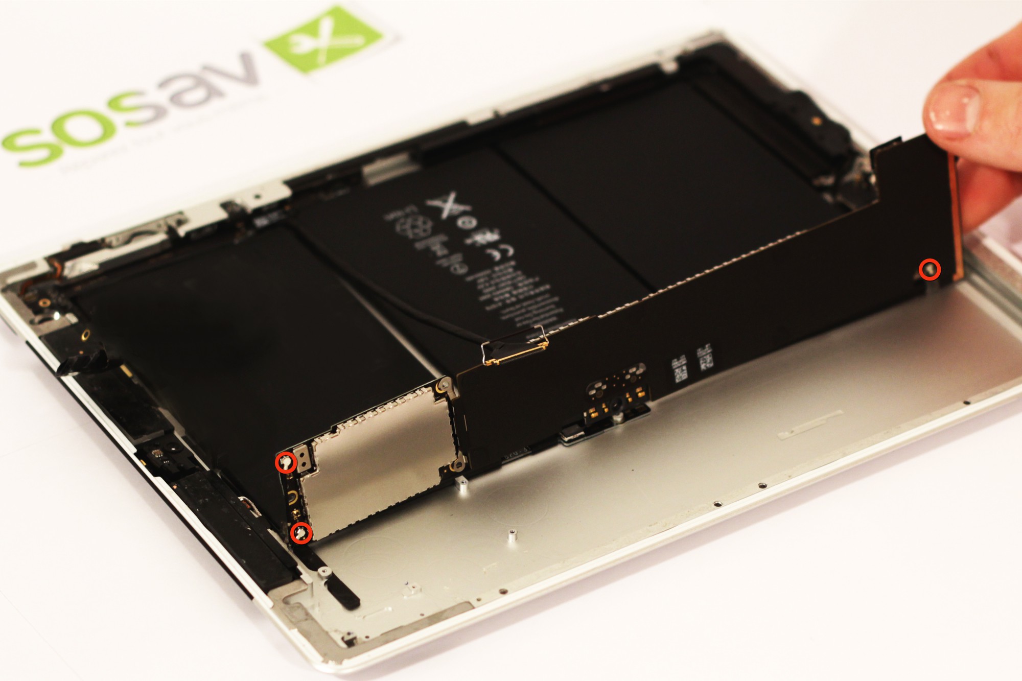 Dévissez maintenant les quatres vis cruciforme entourées en rouge sur la photo. Ces vis retiennent la carte-mère à la coque arrière de votre iPad 2 3G.