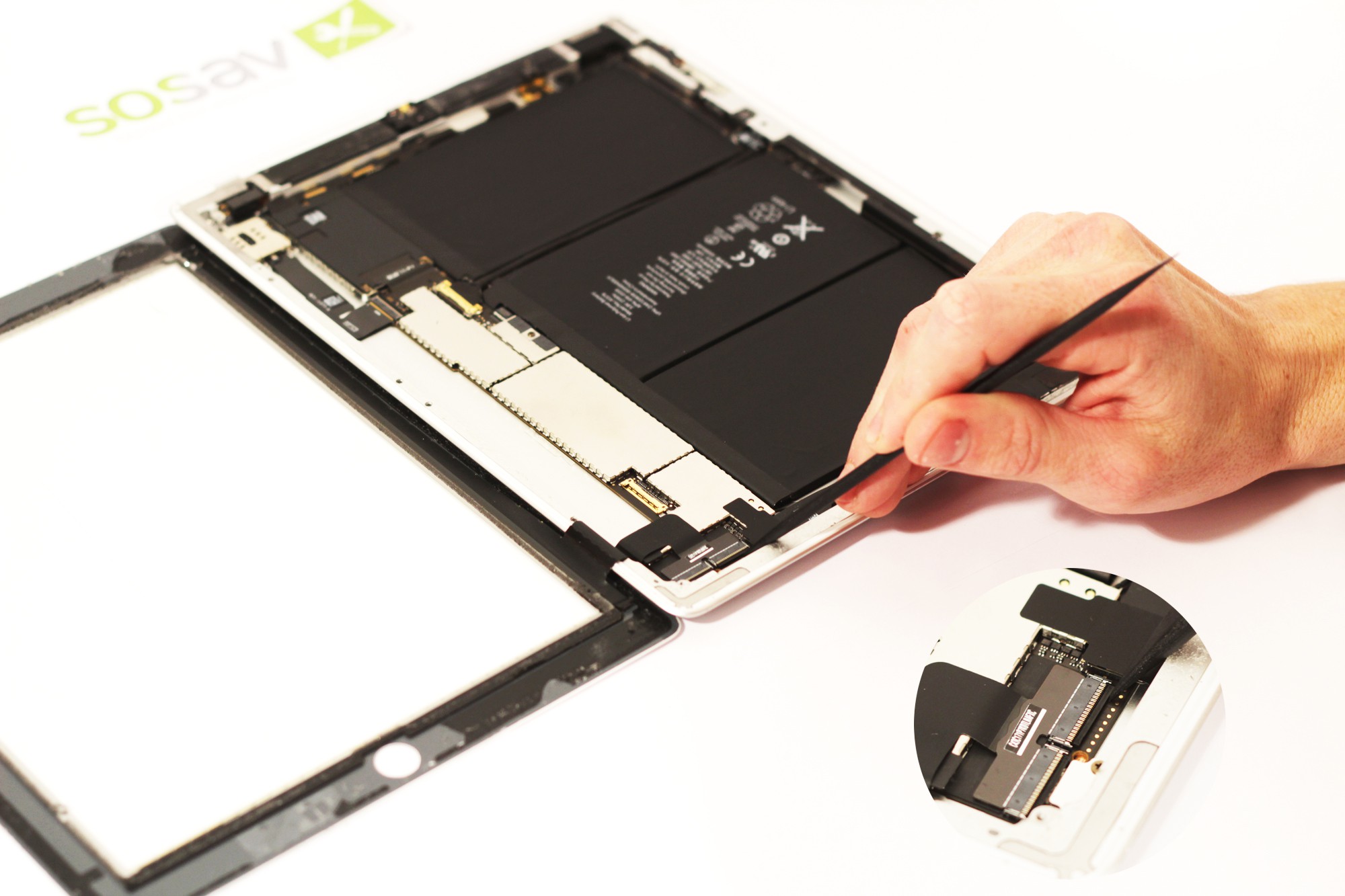 Vous pouvez désormais délicatement soulever la face avant de votre iPad, de la droite vers la gauche.le câble de connexion de la vitre tactile est fragile, ne forcez pas dessus.