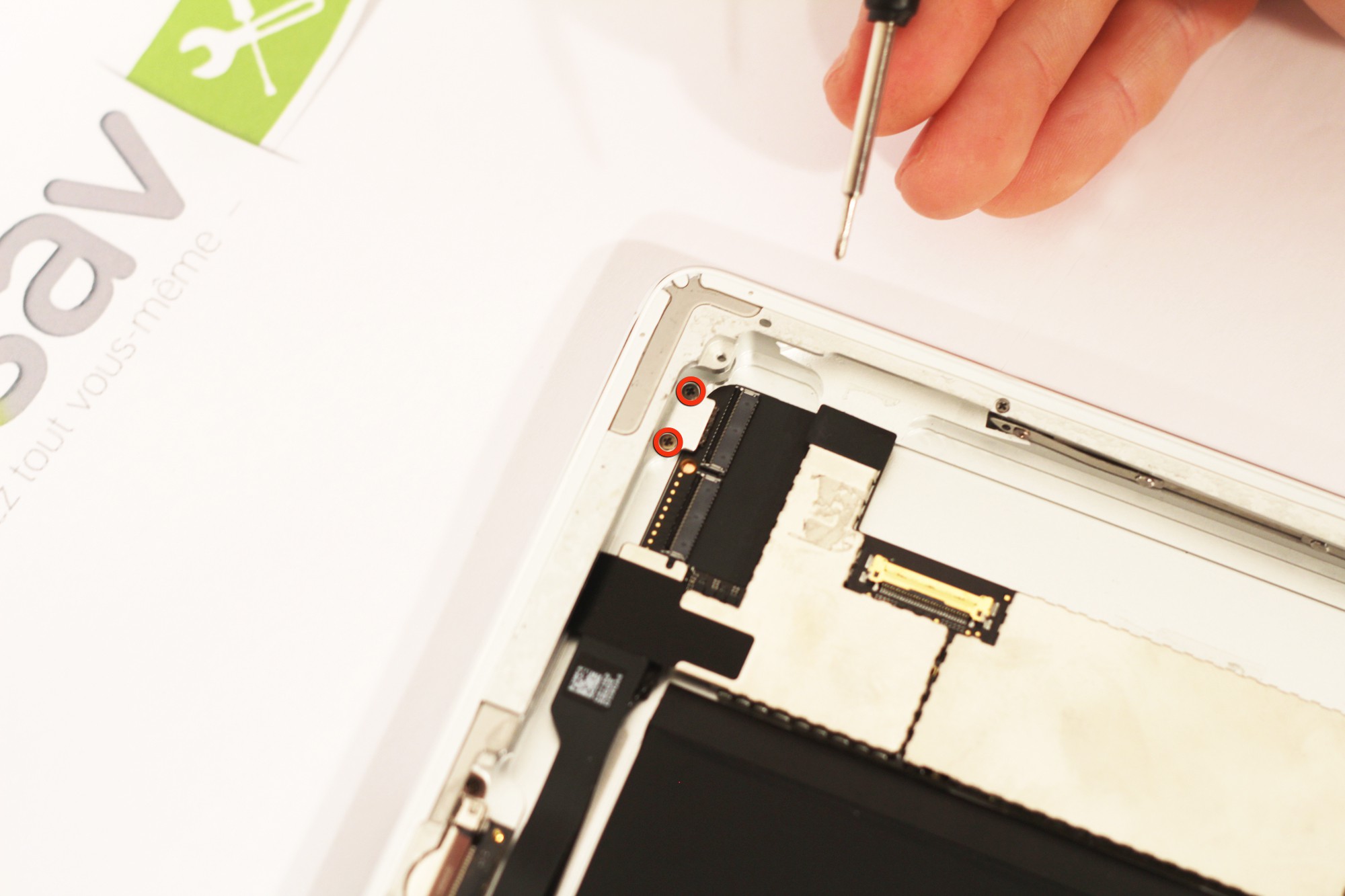 Dévissez désormais les 3 vis de 2mm entourées en rouge, retenant le lecteur SIM à la coque arrière de votre iPad 2.