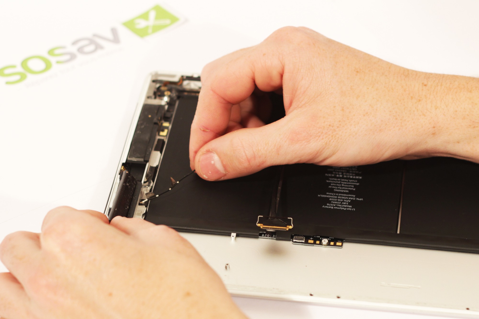 A l'aide d'une spatule en nylon, débranchez les 3 antennes toujours attachées à la carte mère de votre iPad 2.