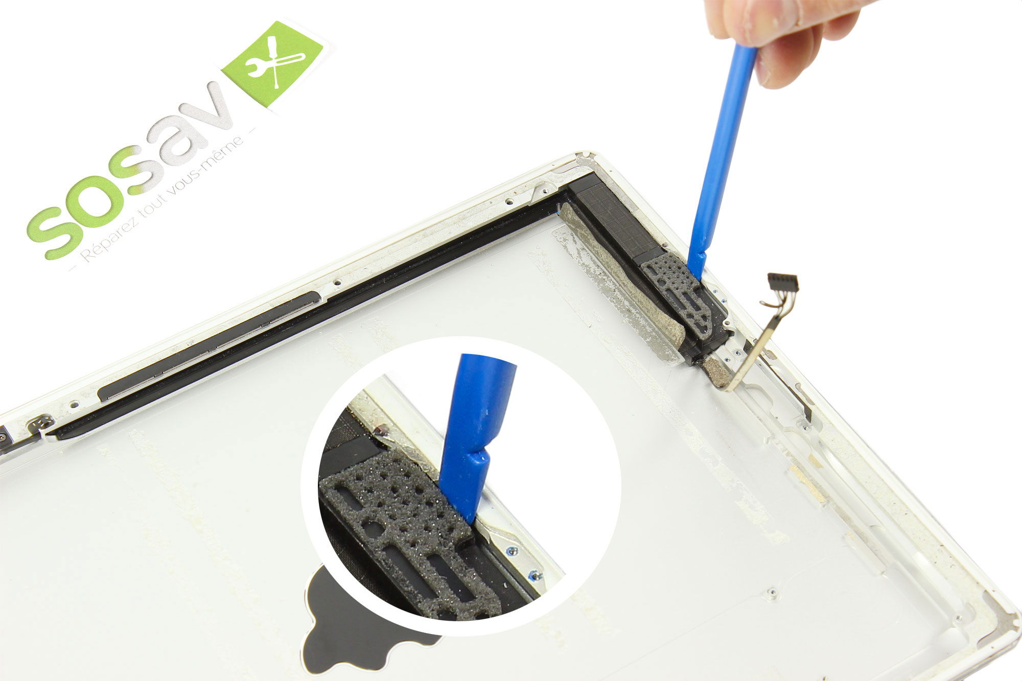 Décollez le ruban adhésif retenant le haut parleur dans son emplacement.