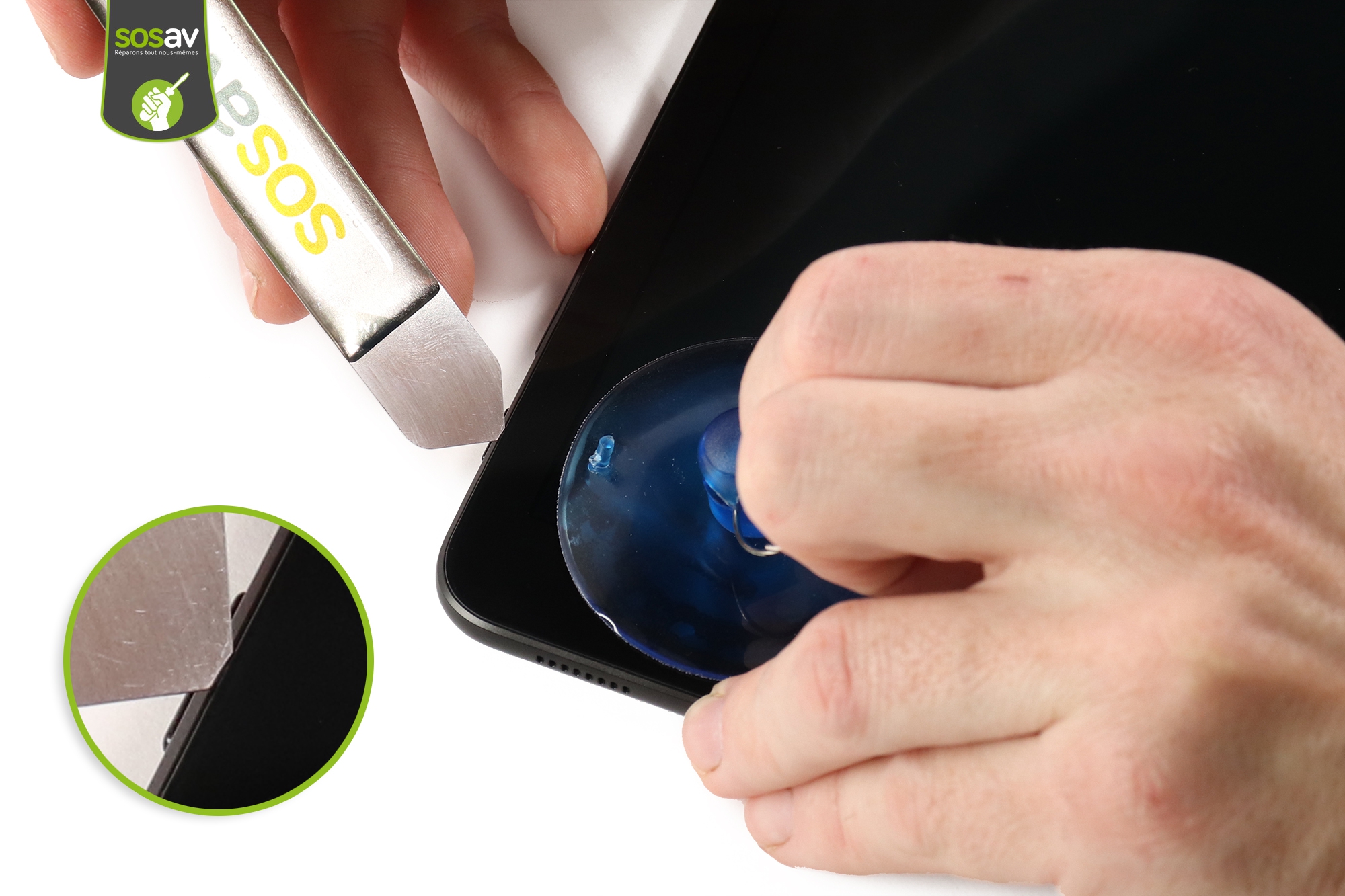 Replacez la ventouse sur le coin de l'écran afin de pouvoir introduire délicatement la iSesamo et créer une ouverture.Aidez-vous de la carte plastique pour maintenir la petite ouverture.Prenez le relais avec le médiator pour commencer à décoller le premier coin.Si besoin, chauffez le tour de l'écran pendant une 20taine de secondes à l'aide du sèche-cheveux !