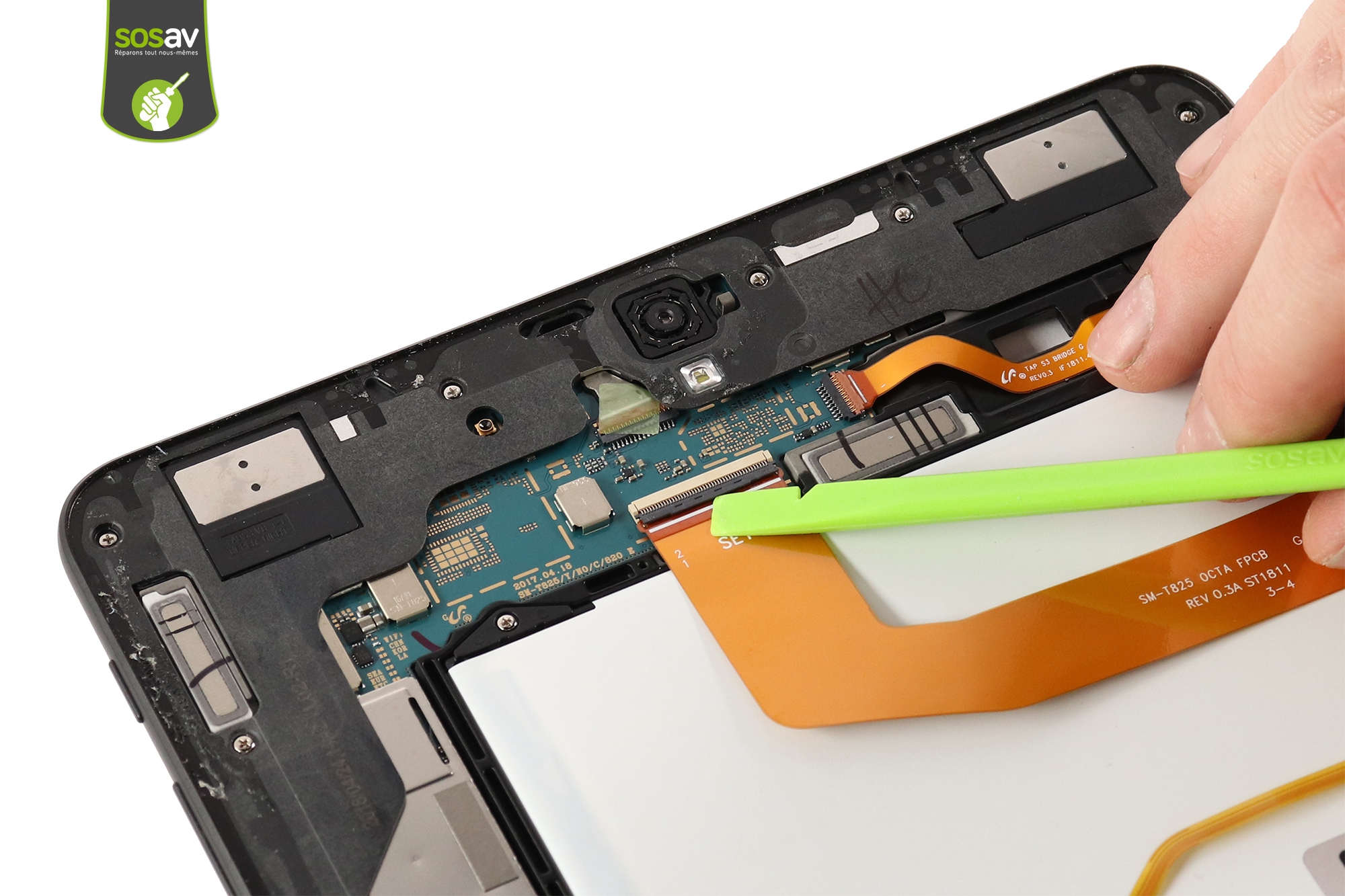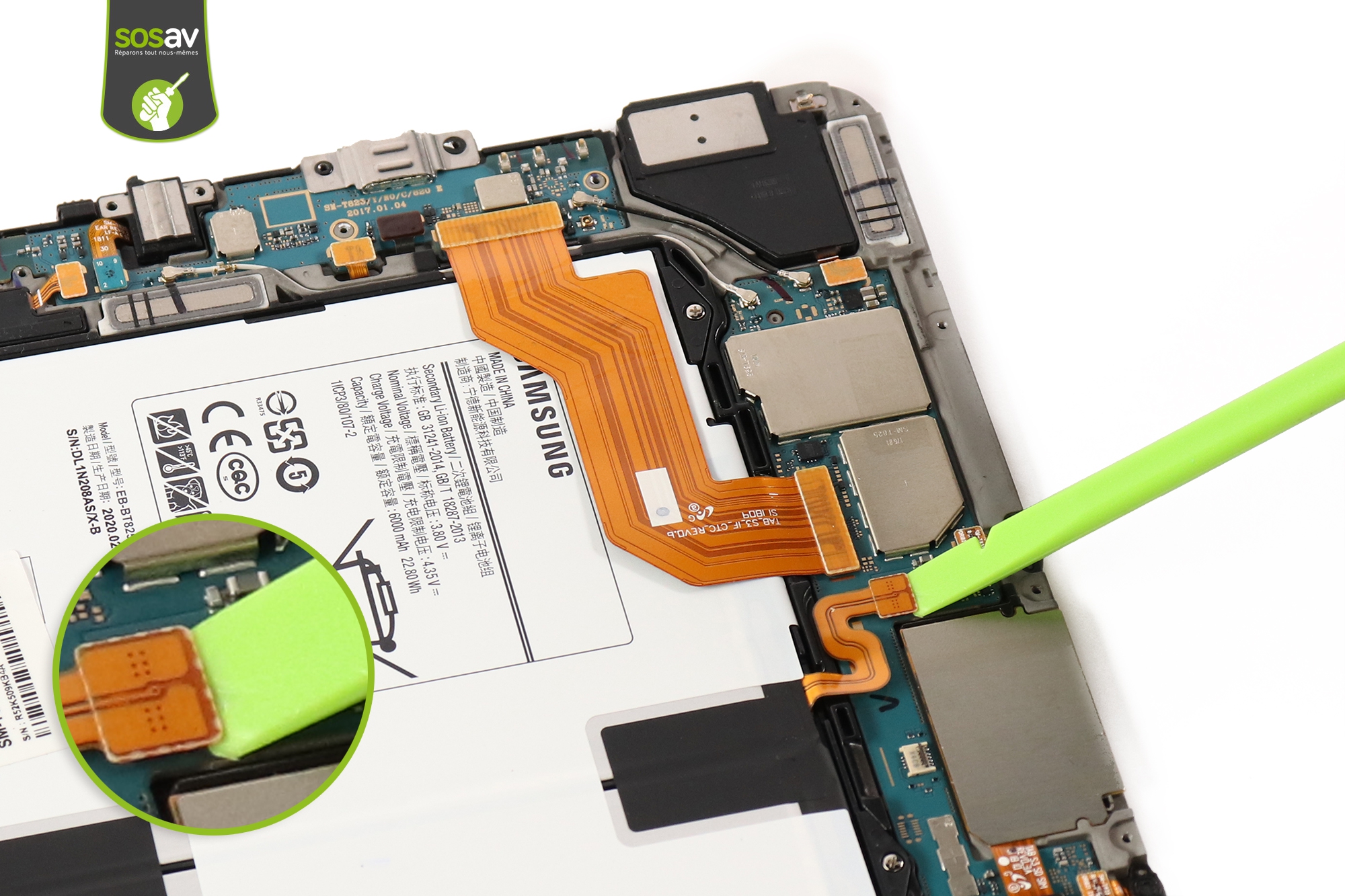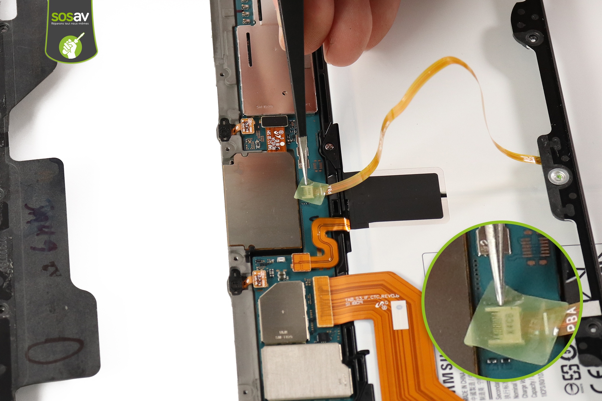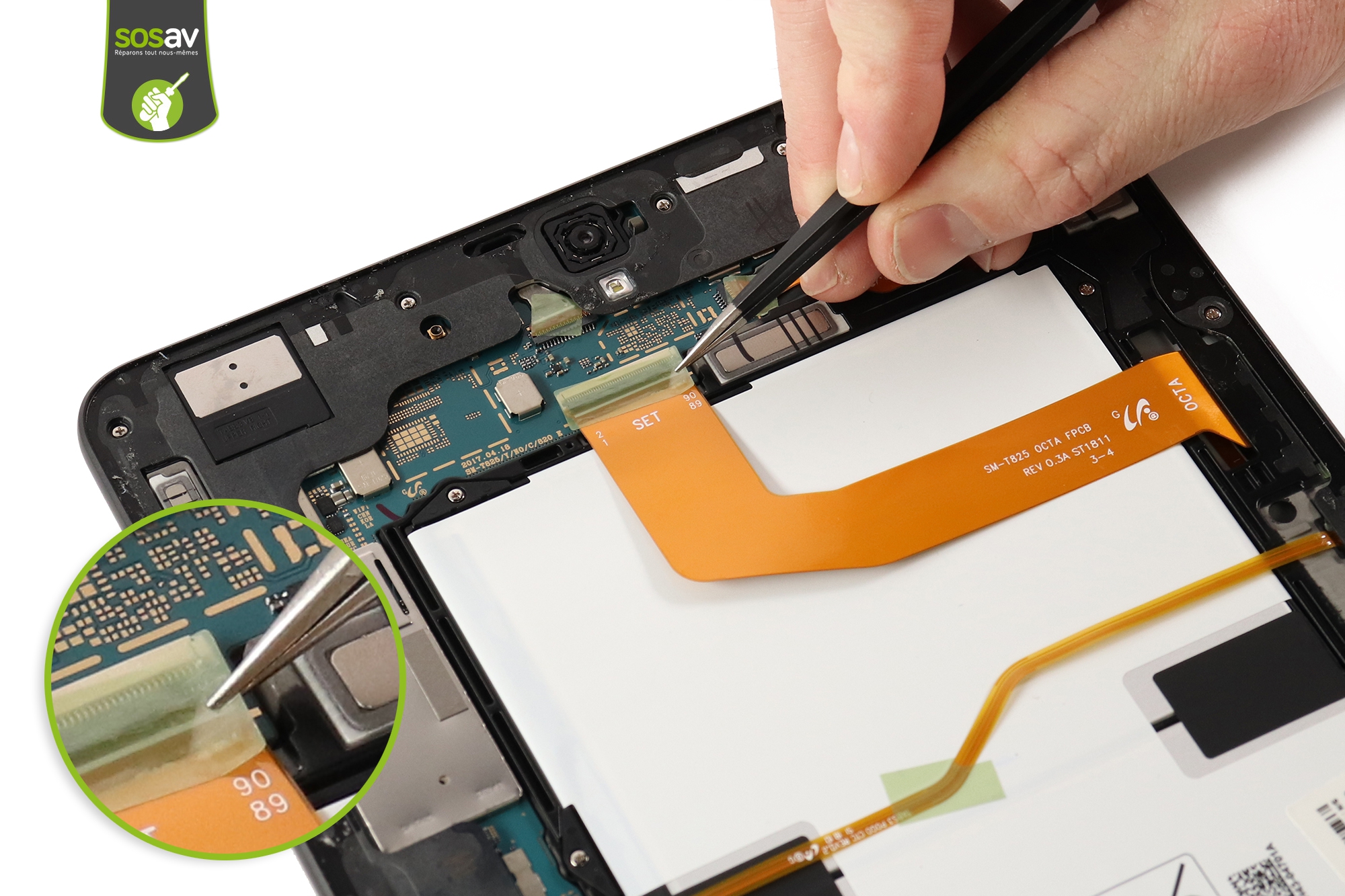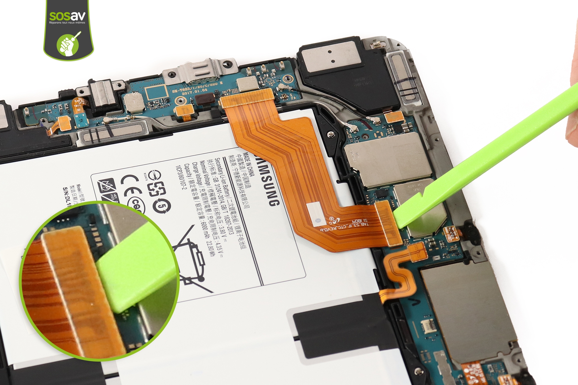 Avant toute chose, déconnectez la nappe de la batterie.Mesure de sécurité pour éviter les éventuels courts-circuits lors de la suite de la réparation Galaxy Tab S3 9.7".