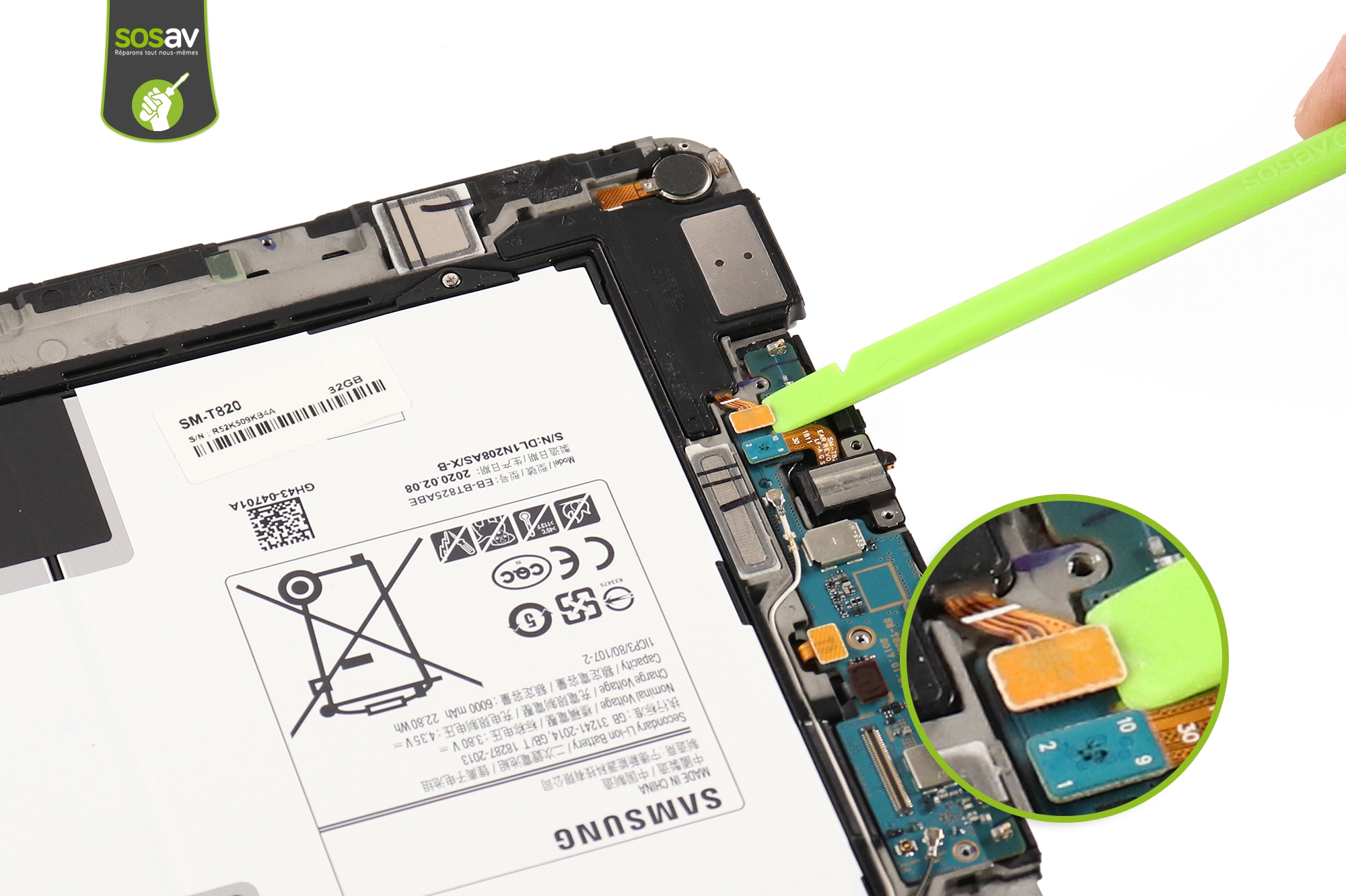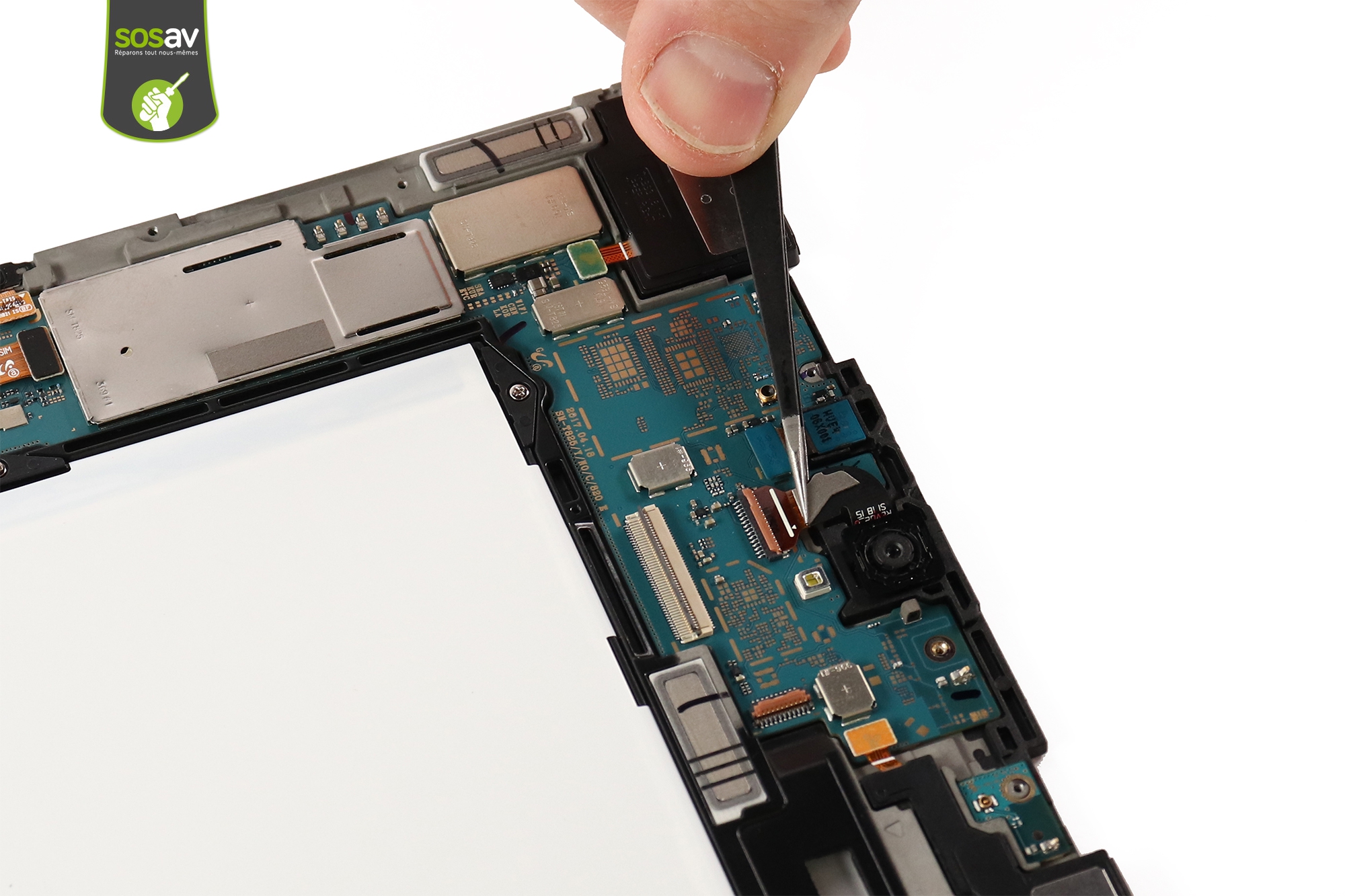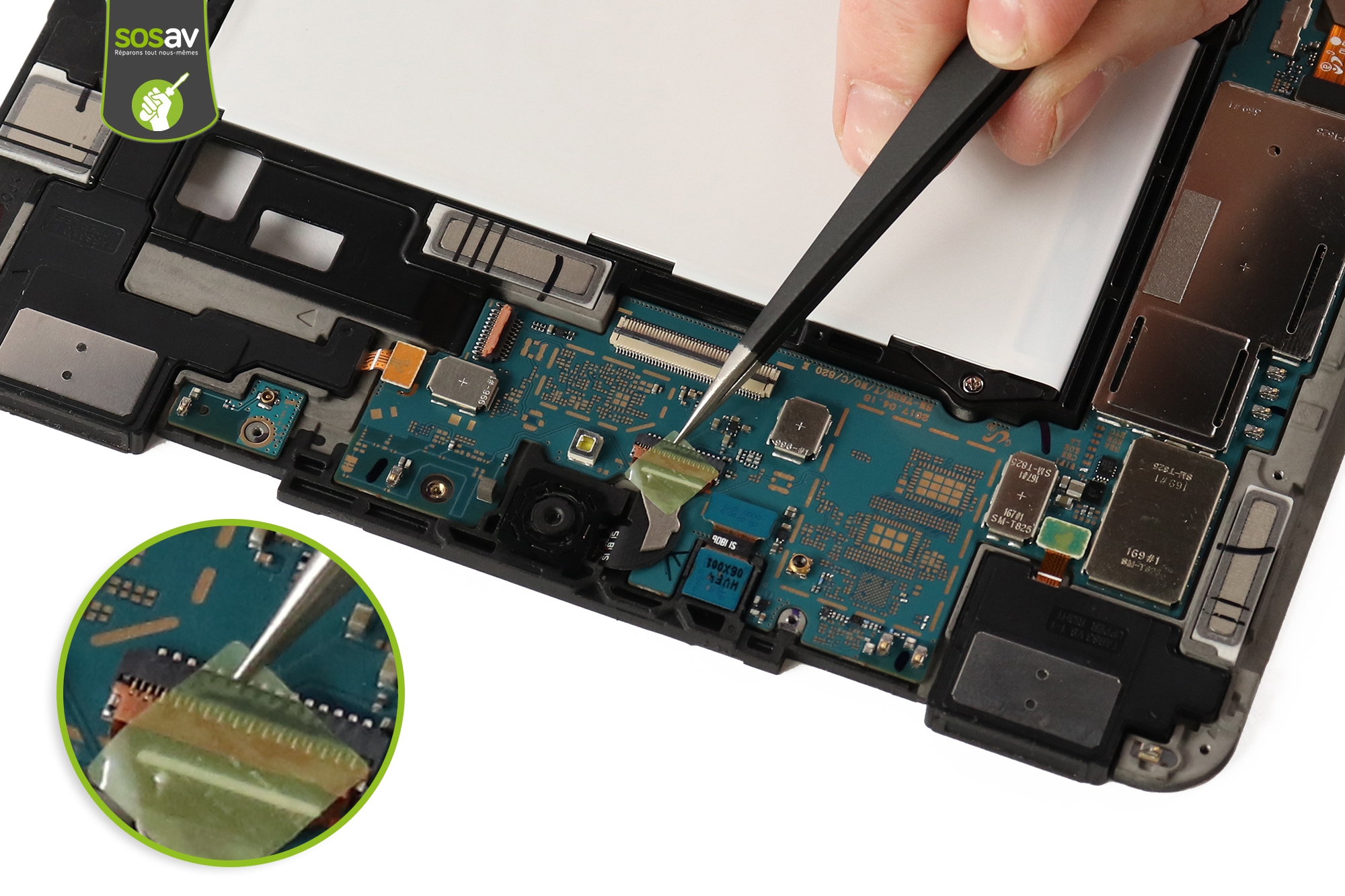 Passez en haut de la tablette !Utilisez la pince pour décoller l'adhésif qui recouvre le connecteur de la caméra arrière.Déverrouillez ensuite le connecteur à l'aide de la spatule en nylon.
