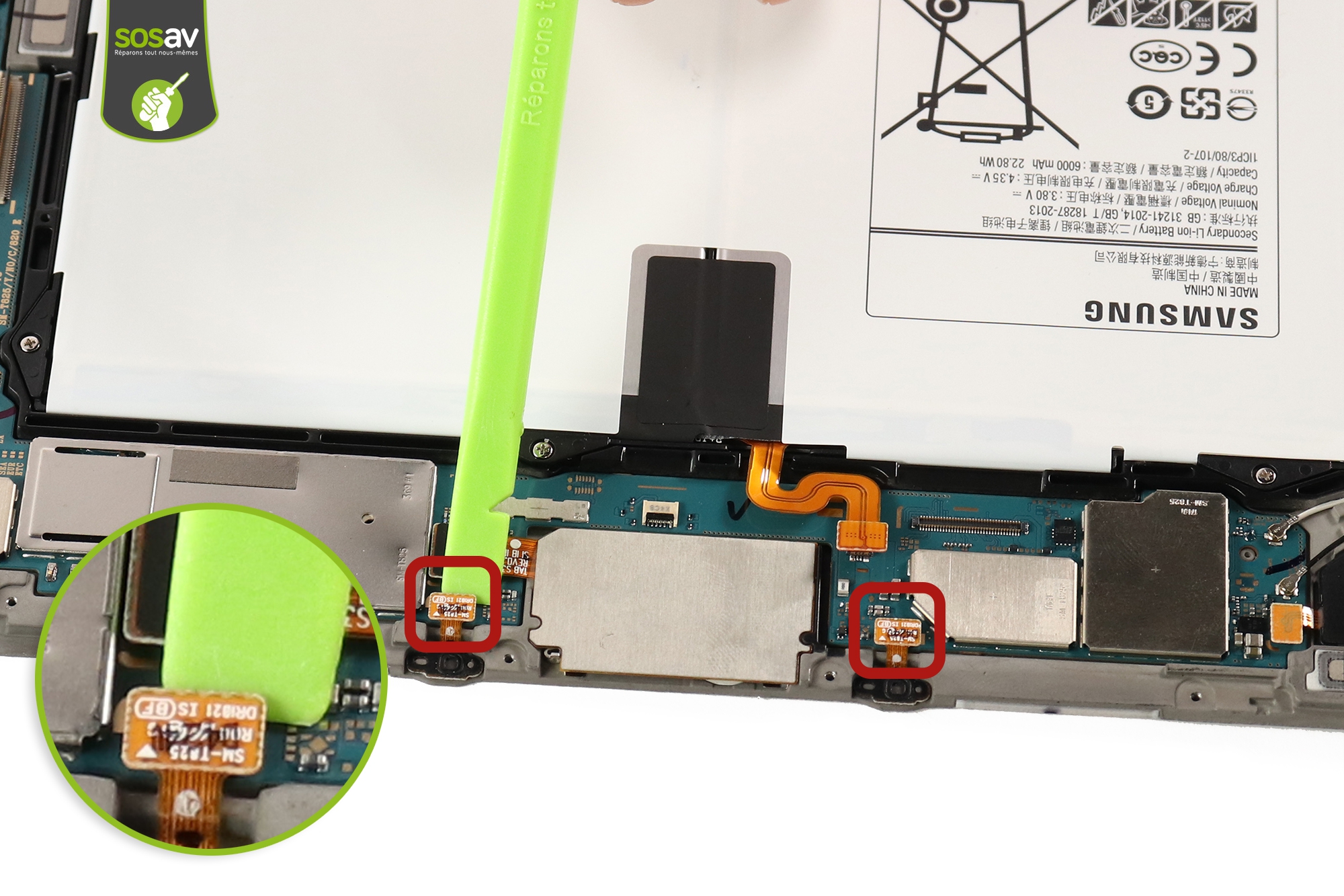 Servez-vous de la pince pour décoller les deux adhésifs transparents qui recouvrent les connecteurs des nappes.
