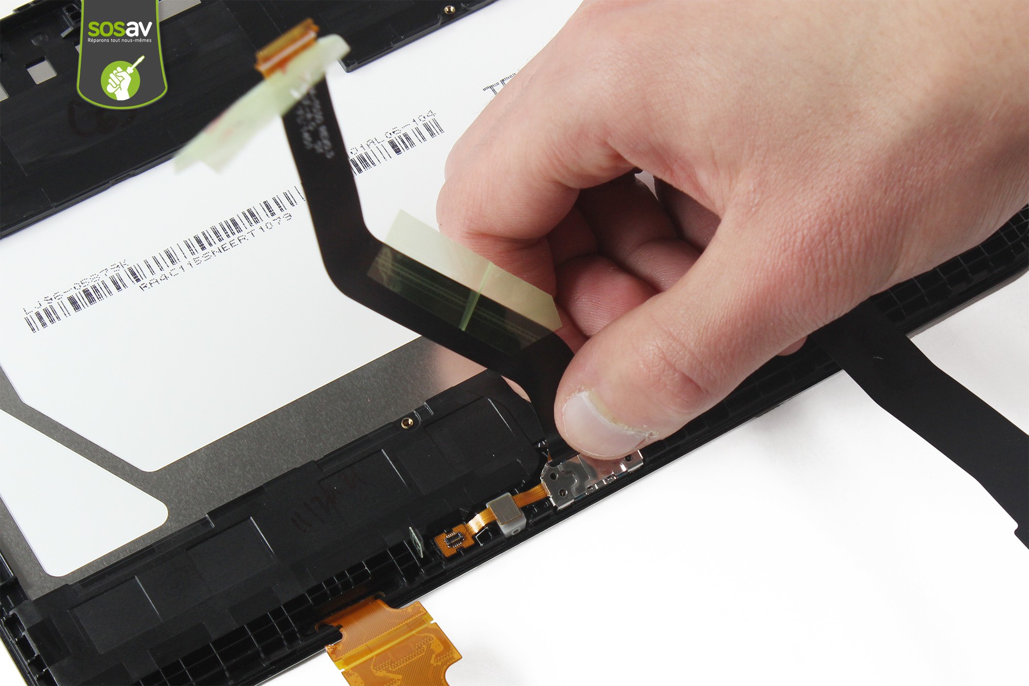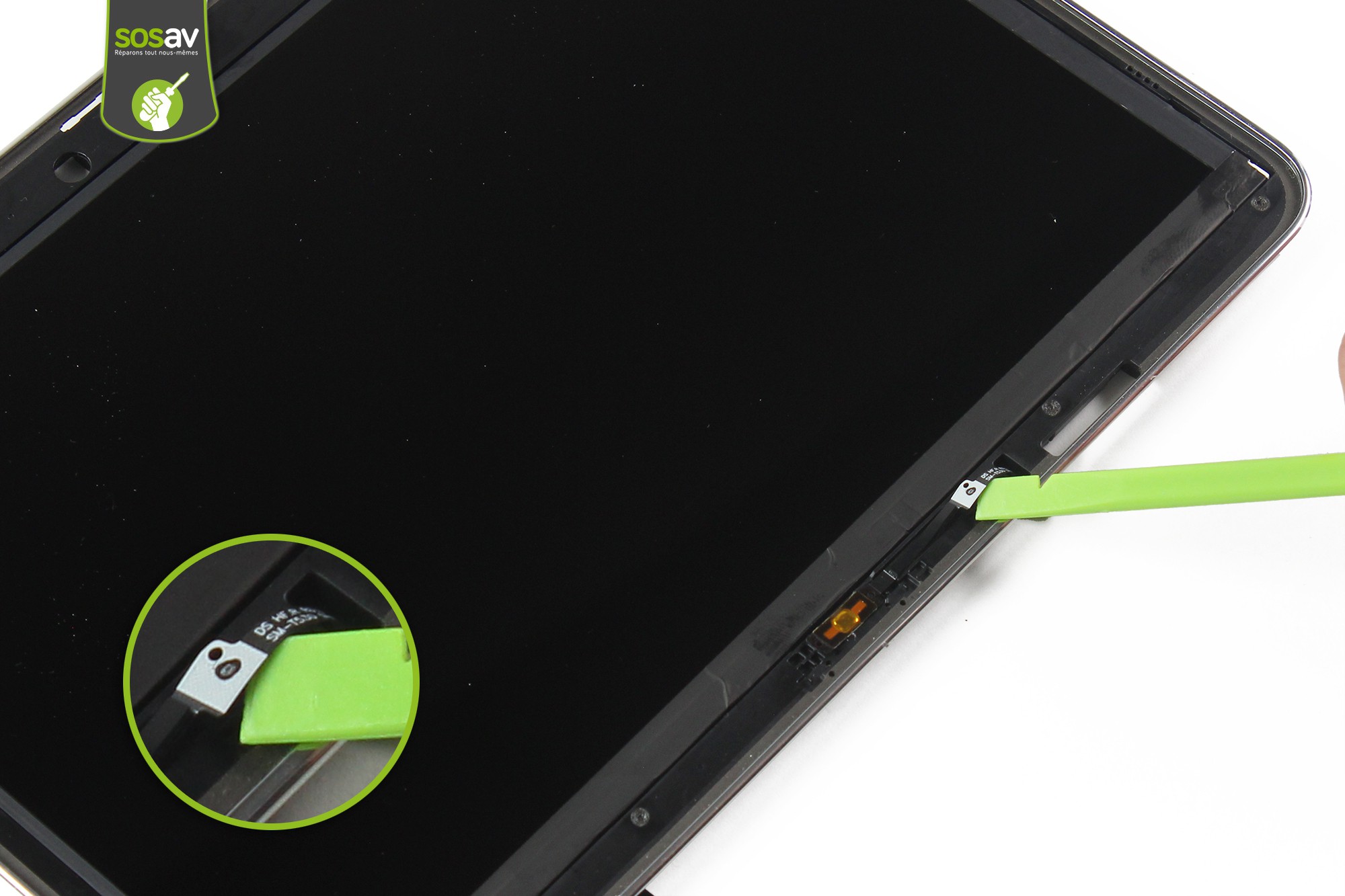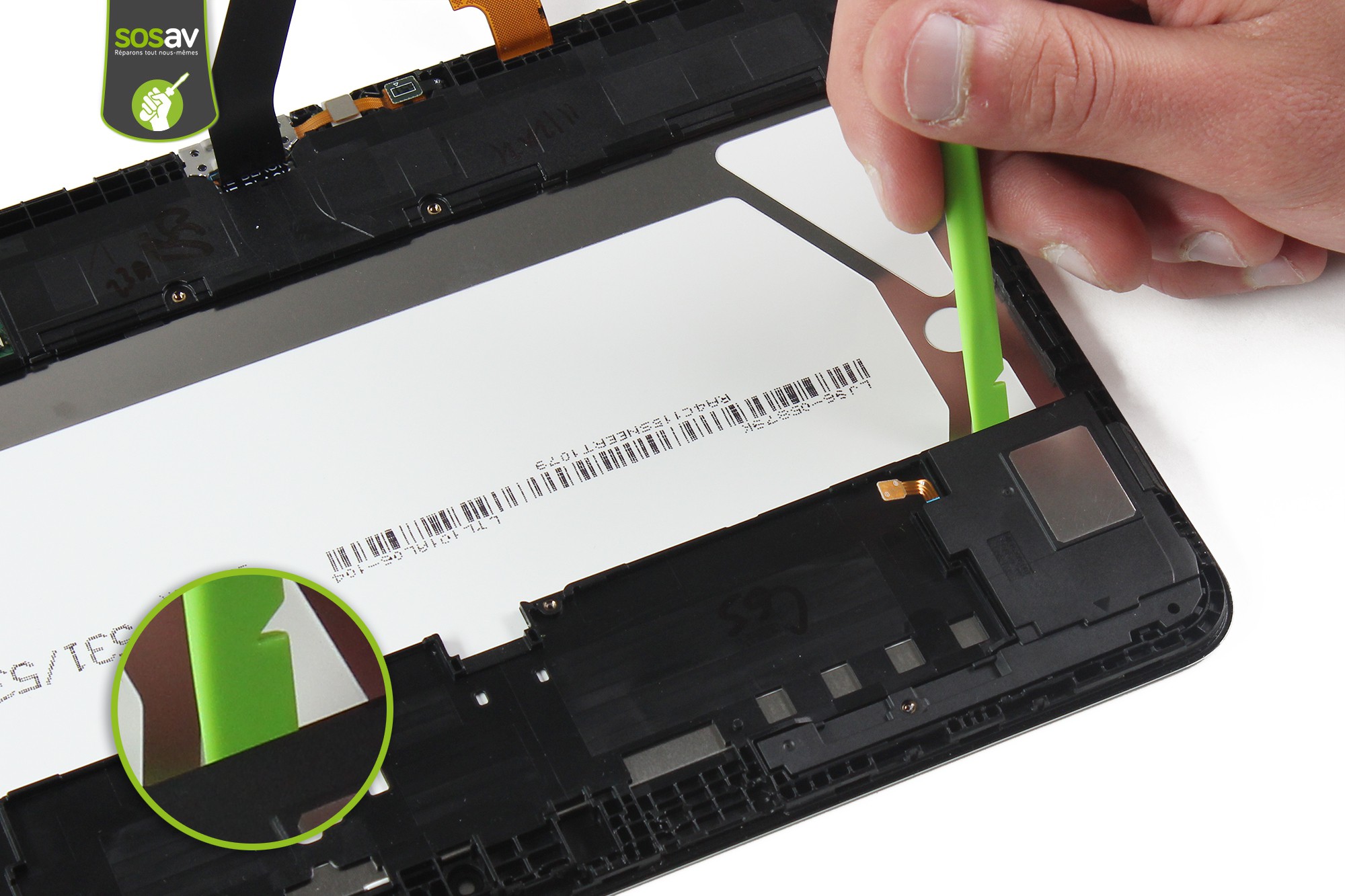Passez la pointe de la spatule en nylon sous la nappe (côté écran) puis décollez-la du châssis.Procédez à son retrait.